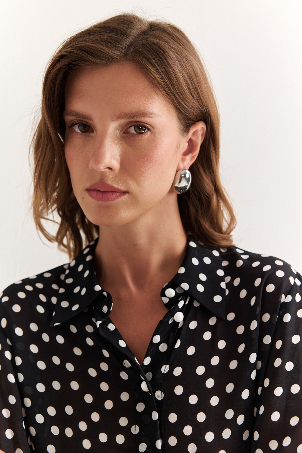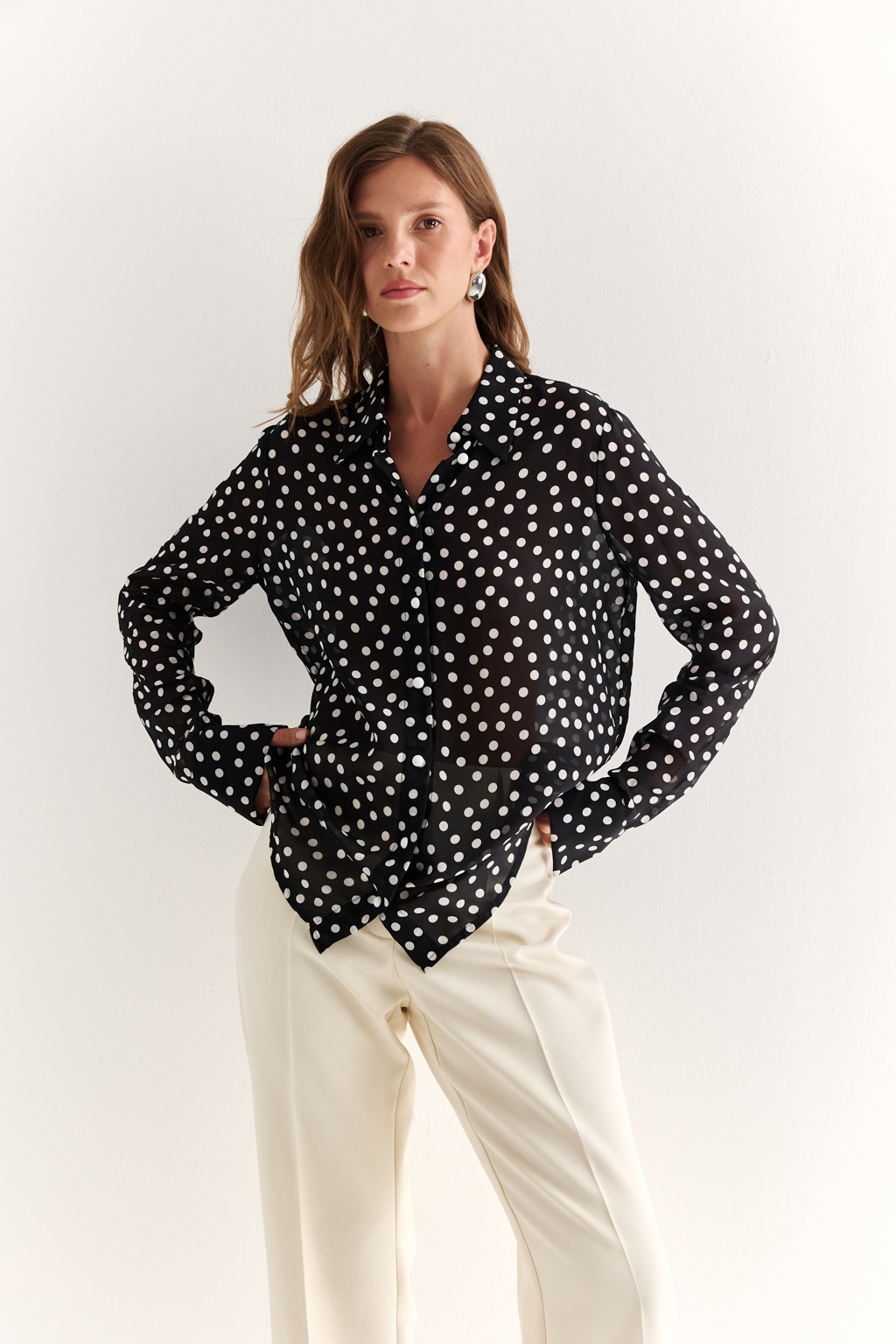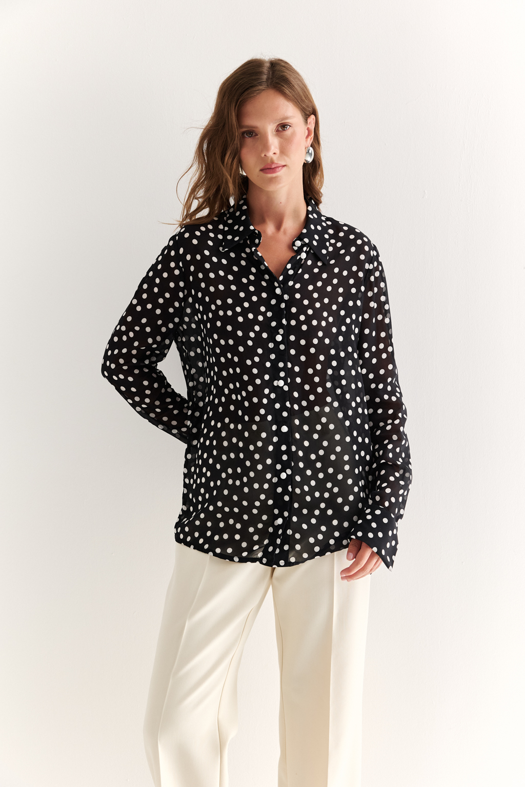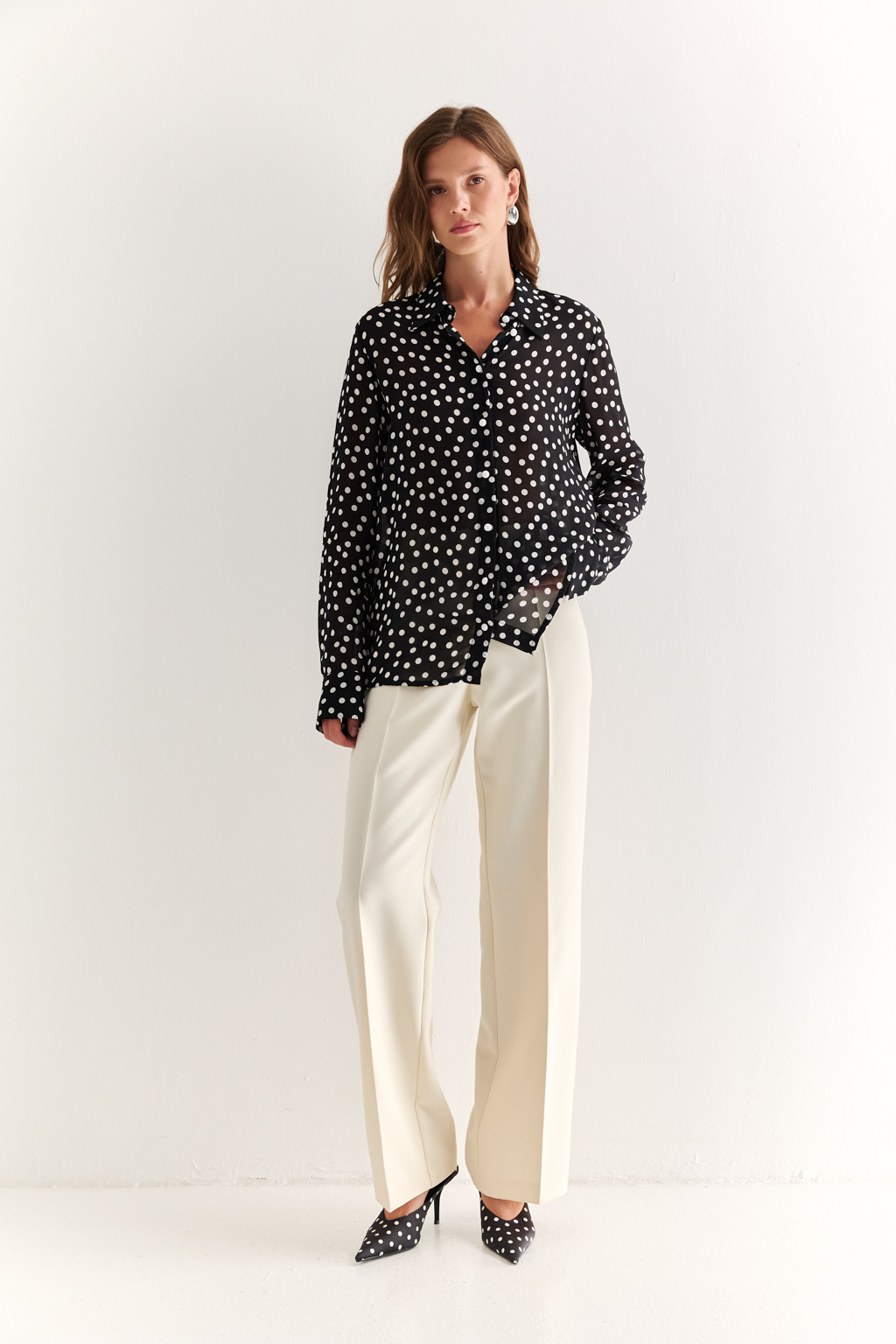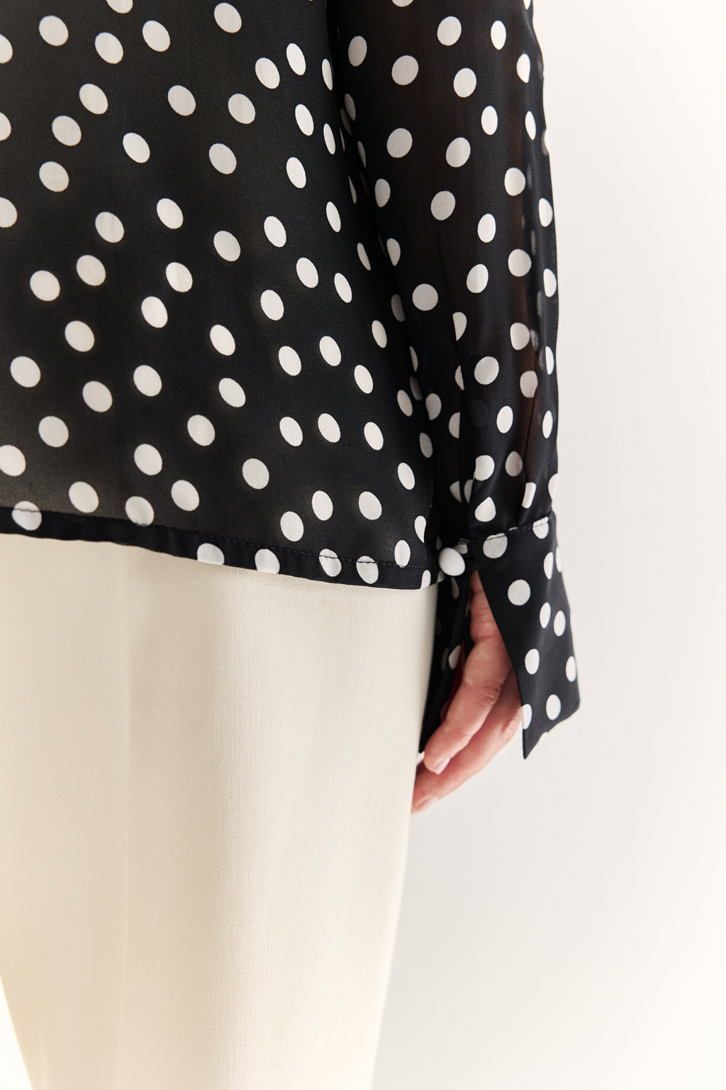 NEW, PREMIUM QUALITY Вискозный шифон крепового переплетения в молочный горошек на черном фоне