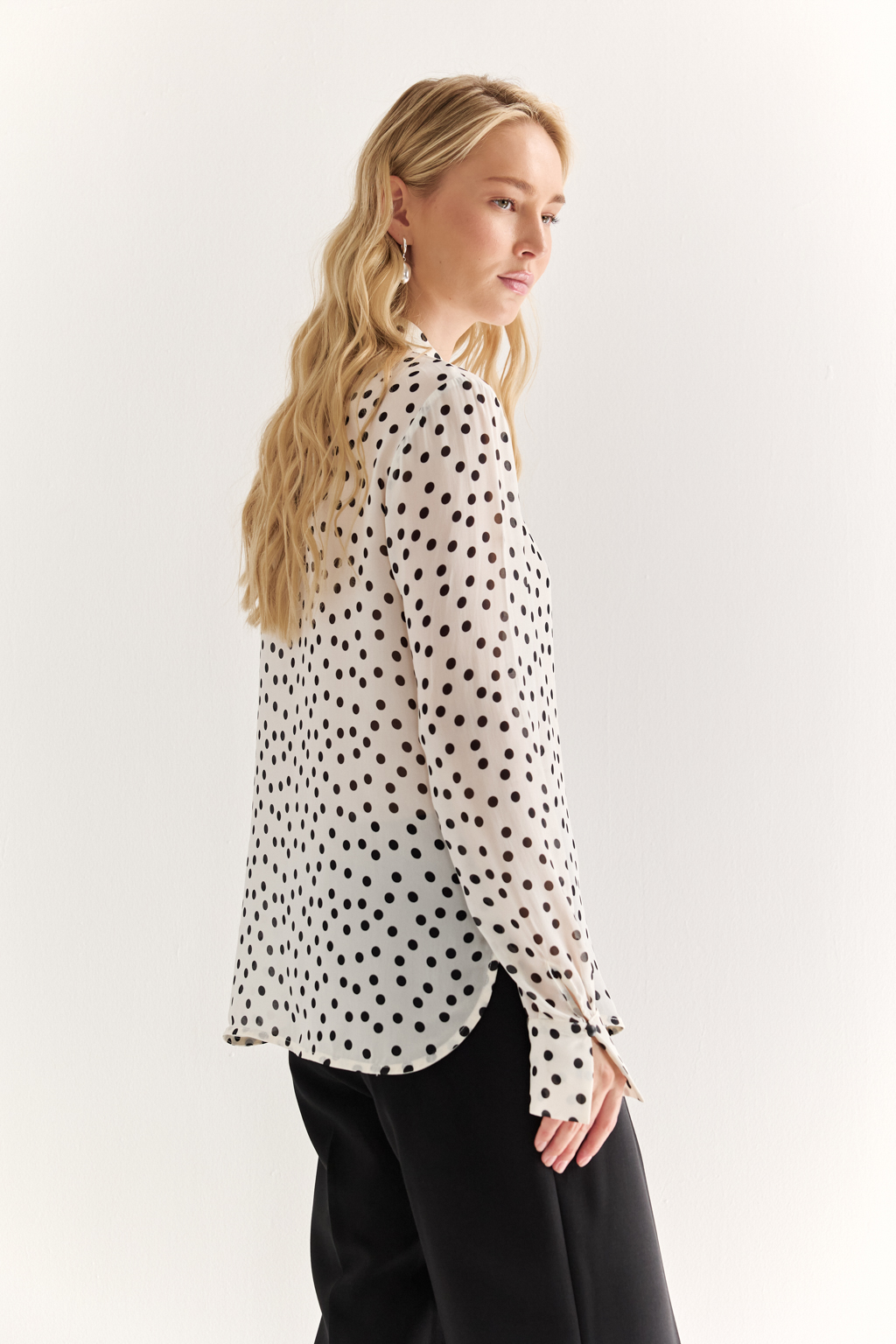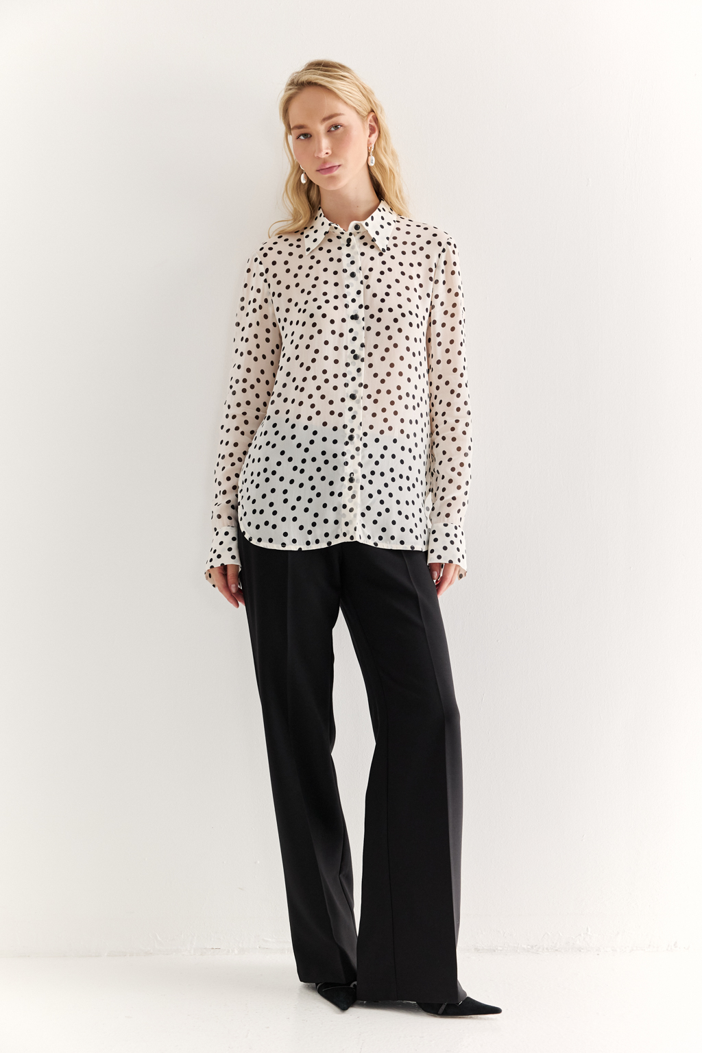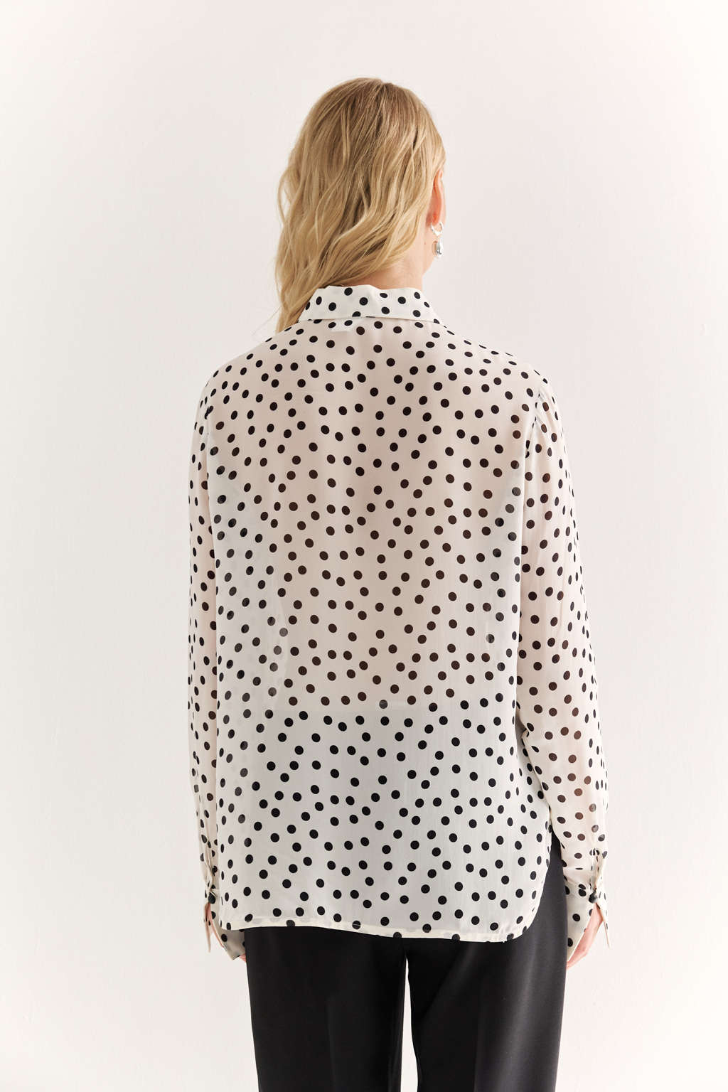 NEW, PREMIUM QUALITY Вискозный шифон крепового переплетения в черный горошек на молочном фоне