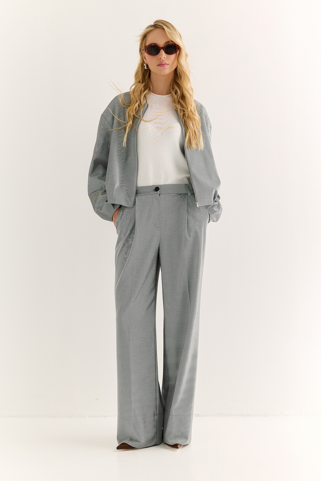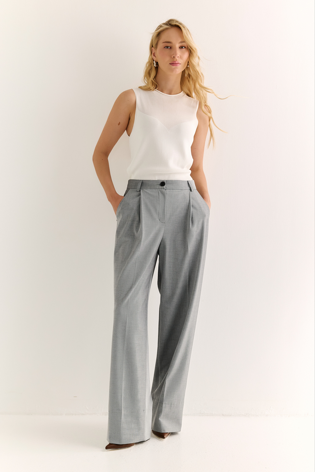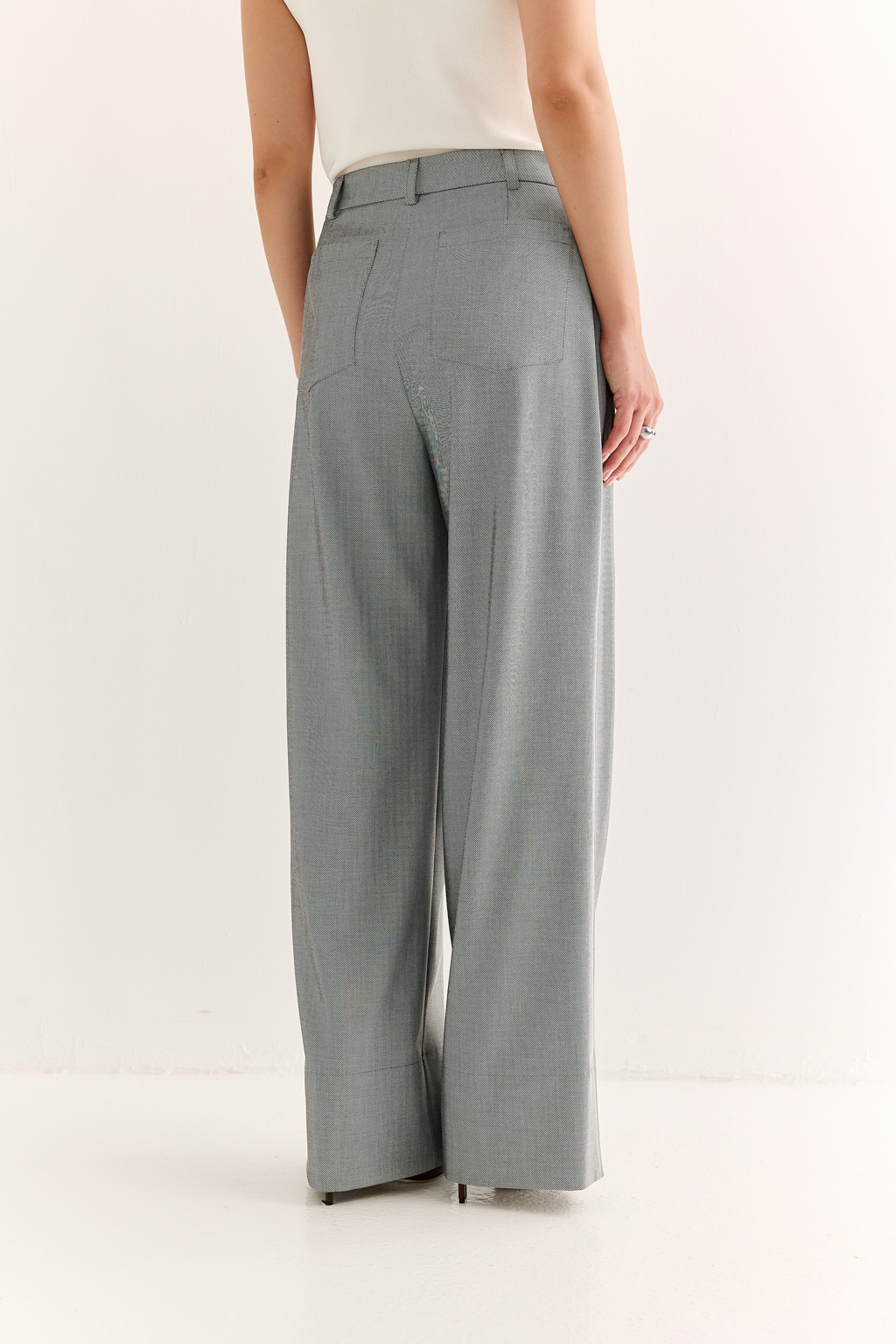 Прямые брюки с широкой подгибкой ни низу: свобода, стиль и архитектура линии Эти брюки созданы для того, чтобы заявить о себе с первого шага. Глубокие складки спереди придают объём и подчёркивают движение ткани, высокая посадка удлиняет ноги и акцентирует талию, а накладные карманы сзади добавляют расслабленной дерзости. Широкая подгибка по низу — модный приём, который добавляет тяжести силуэту и делает образ собранным. Брюки идеально сочетаются с укороченными жакетами, приталенными топами или мужскими рубашками навыпуск — для городского шика без усилий. Графичные, выразительные, женственные.