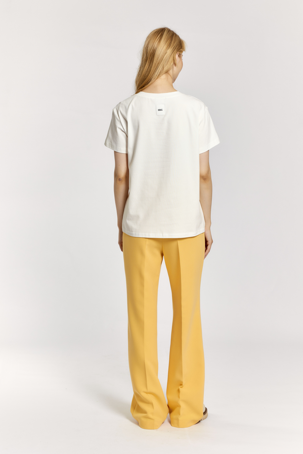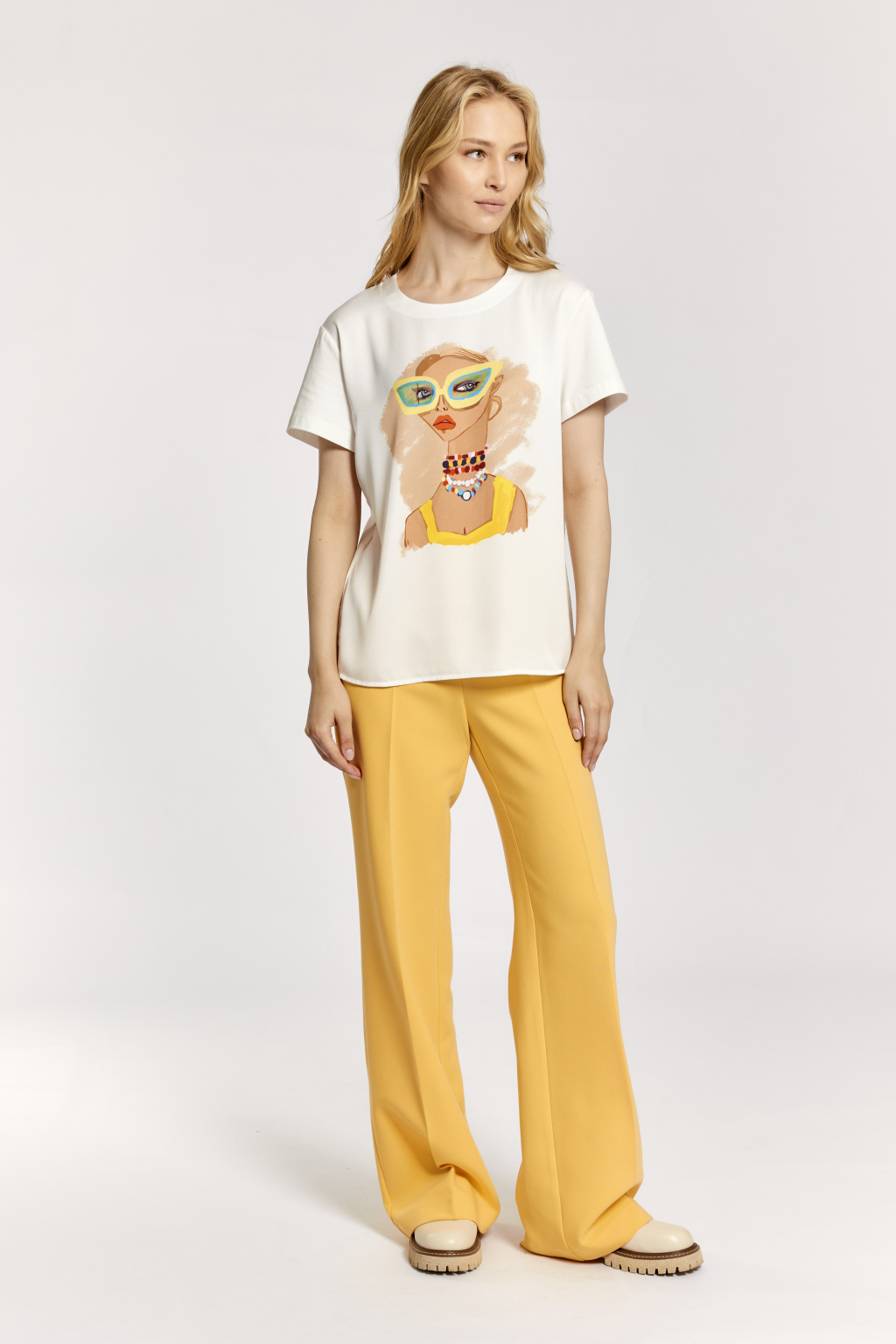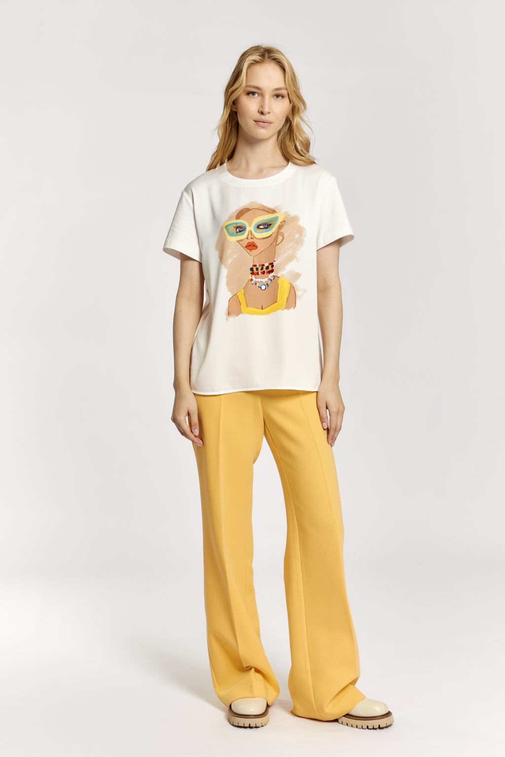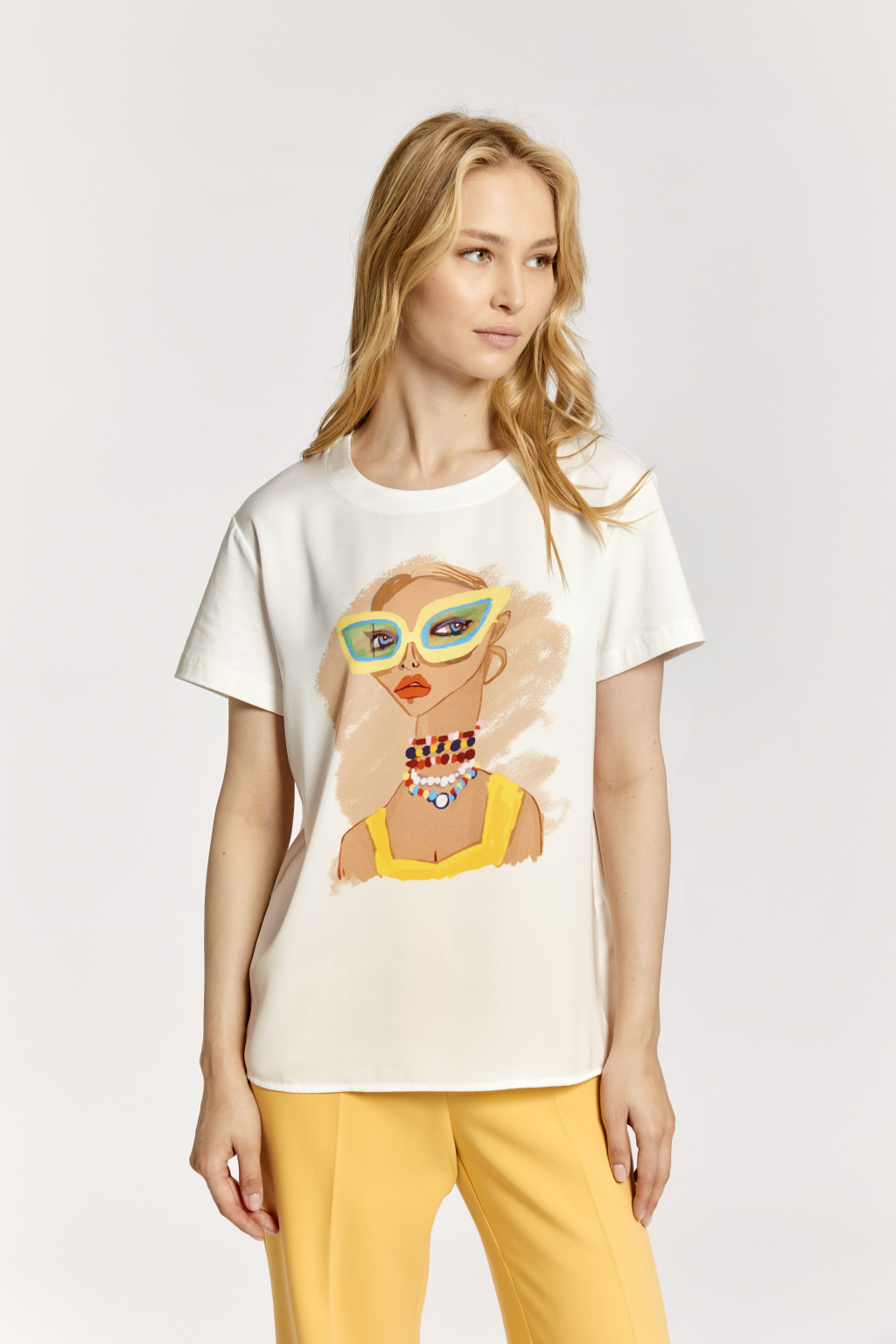 Полочка: креп блузочный в белом цвете. Принт девушка в желтых очках  Спинка, рукава: хлопковое трикотажное полотно молочного цвета. (92% хлопок, 8% лайкра)