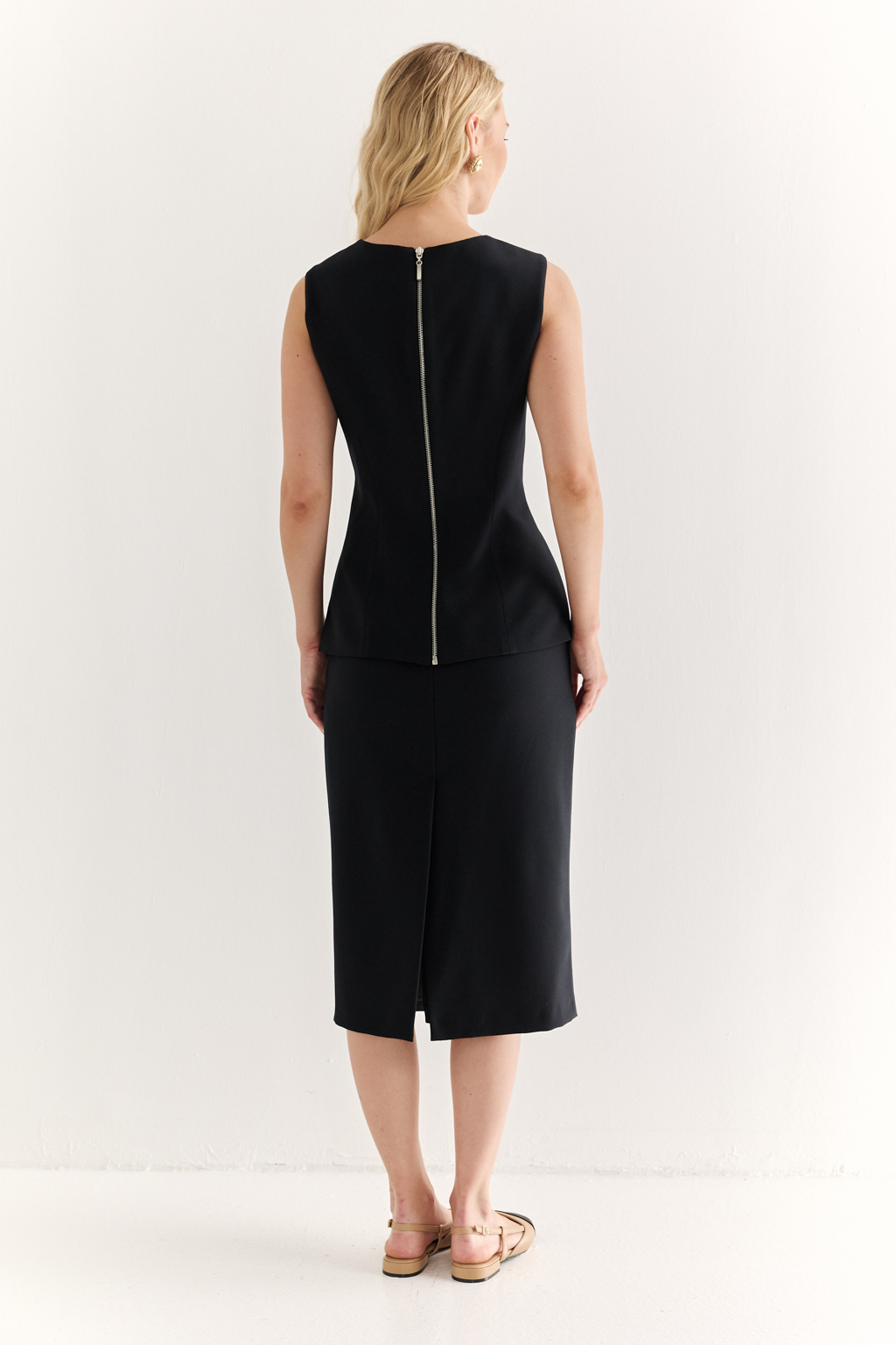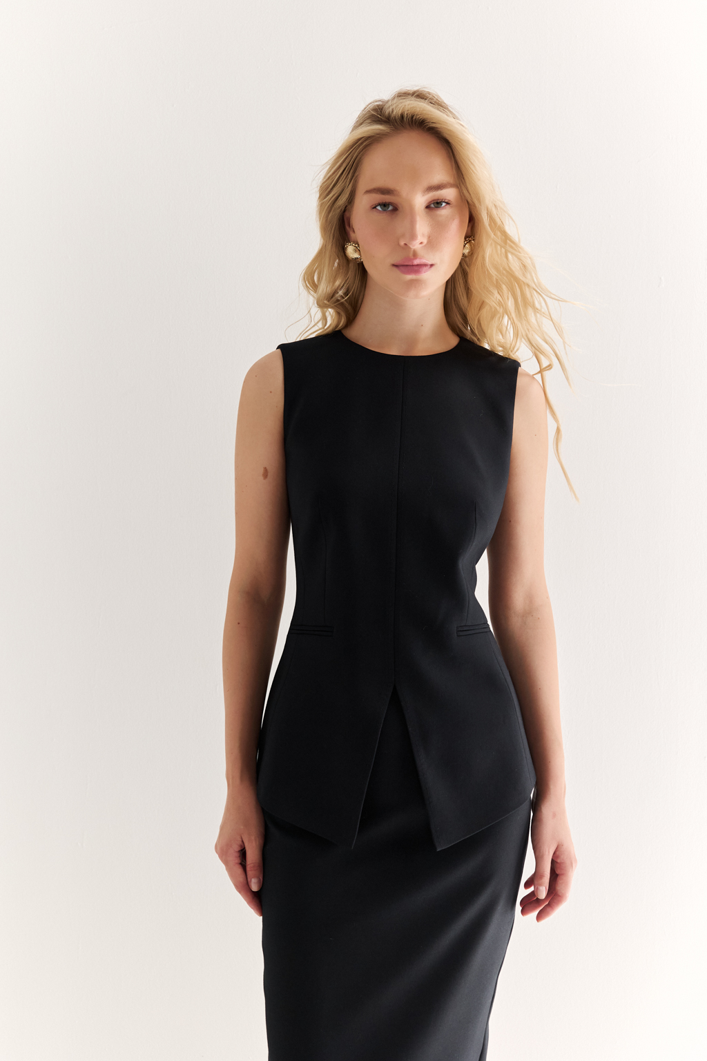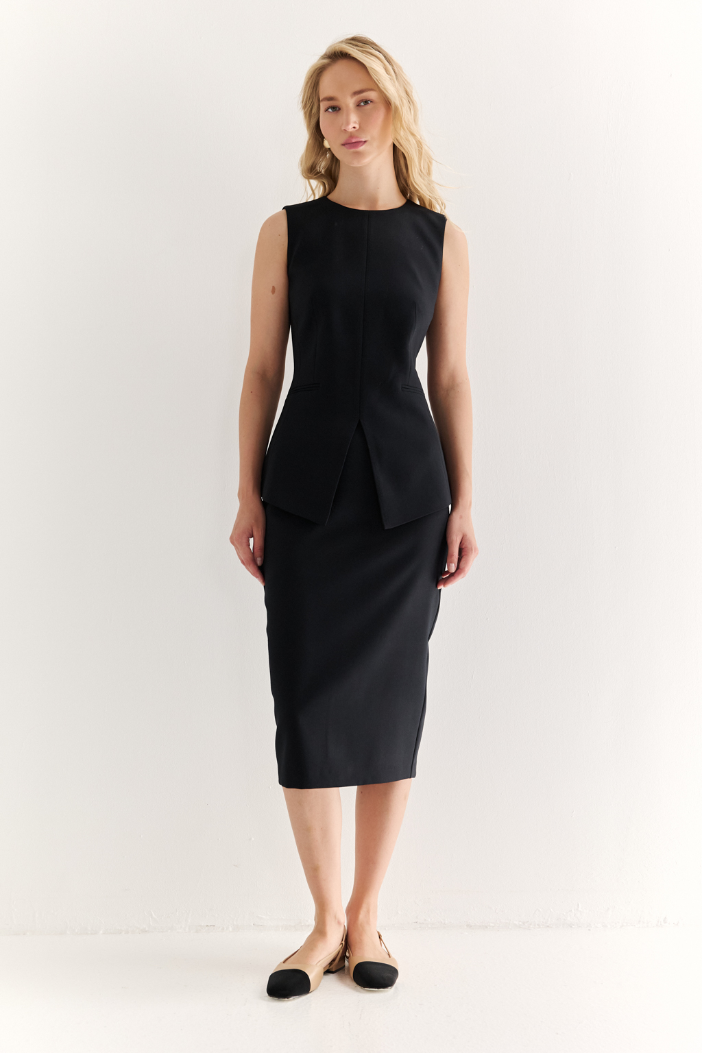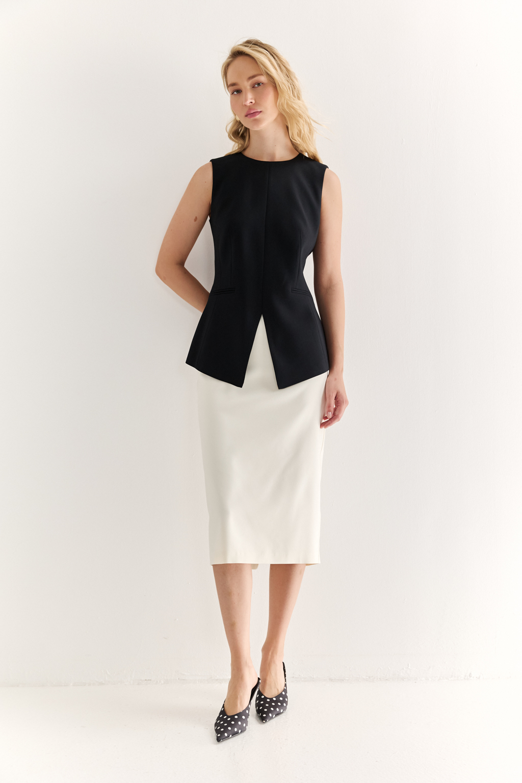 Жилет с акцентной талией: структура, которая вдохновляет Жилет приталенного силуэта с удлинёнными линиями — элегантная альтернатива жакету в современном гардеробе. Вертикальные рельефы и чёткая посадка подчёркивают фигуру, визуально вытягивая силуэт. Удлинённые углы полочек придают образу динамику, а отсутствие рукавов делает жилет универсальным элементом многослойных композиций. Идеален для деловых комплектов с брюками или юбками, а также в кэжуал-образах. Форма, которая работает на стиль. Силуэт, который говорит за вас.