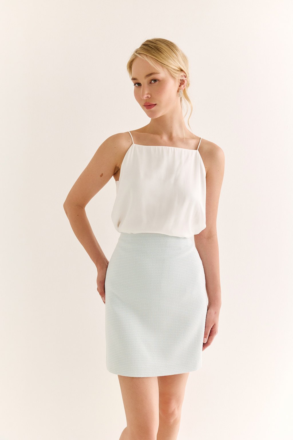 Мини-юбка в комплект к жакету: лаконичность, подчёркивающая форму Мини-юбка прямого силуэта — идеальная партнёрша к жакету с акцентом на бёдра. Лаконичный крой, гладкий пояс и точные вытачки создают чистую, сбалансированную линию, позволяя верхней части комплекта выйти на первый план. Модель выполнена без лишних деталей, чтобы подчеркнуть силуэт и структуру образа. Благодаря универсальности и выверенной длине, юбка подходит как для total-look с жакетом, так и для самостоятельных стилизаций — с блузами, трикотажем или рубашками. Минимум формы — максимум выразительности.
