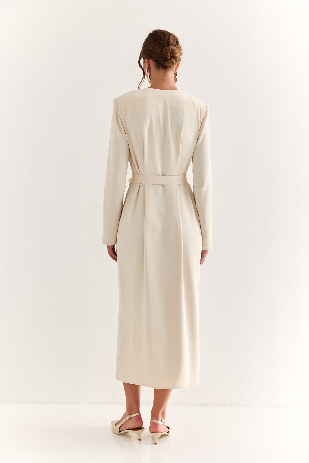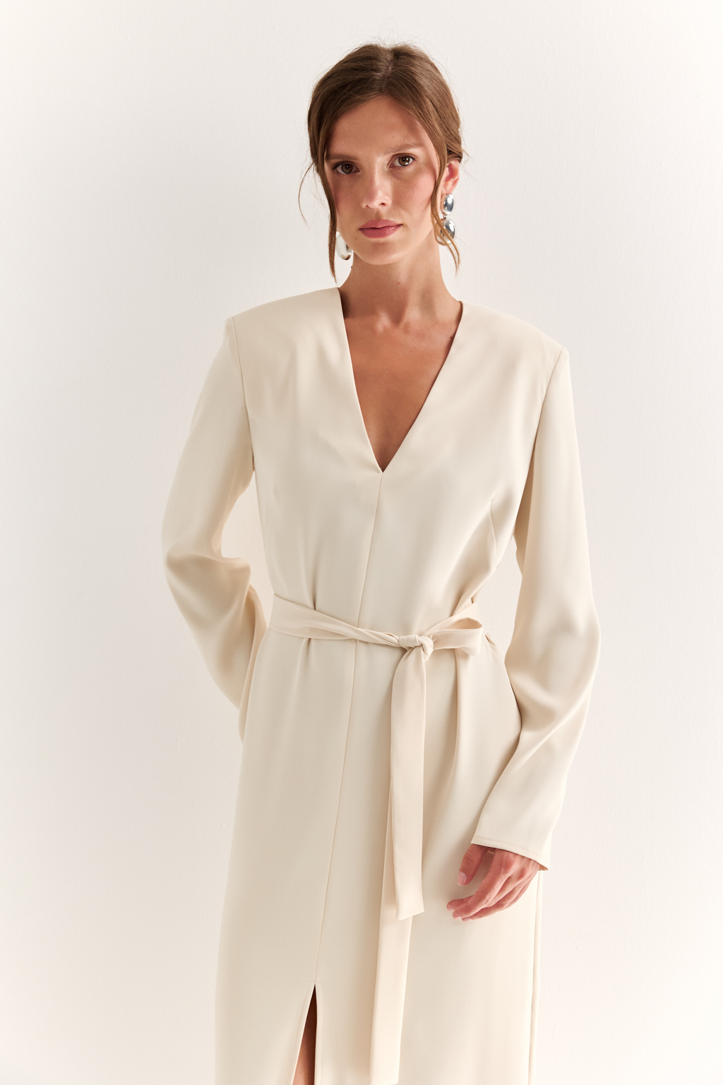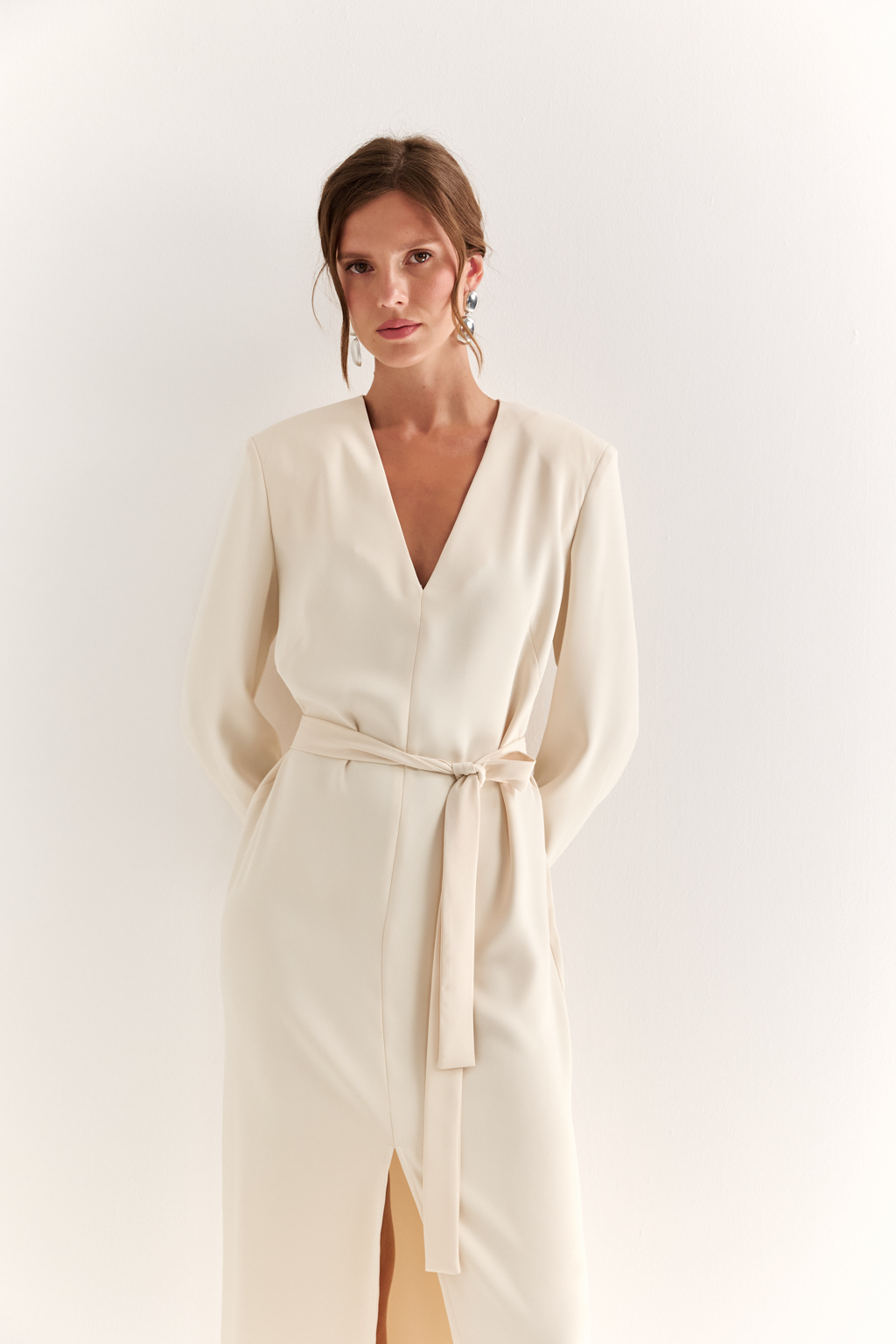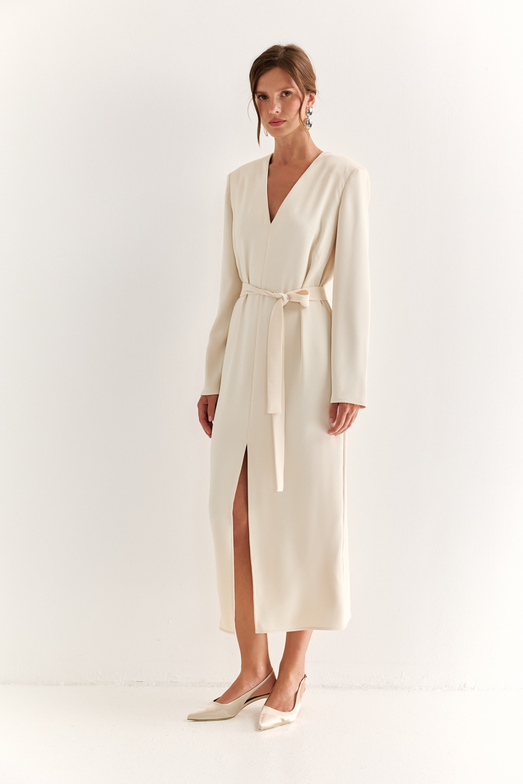 Платье прямого силуэта длиной миди и с V-образным вырезом горловины.