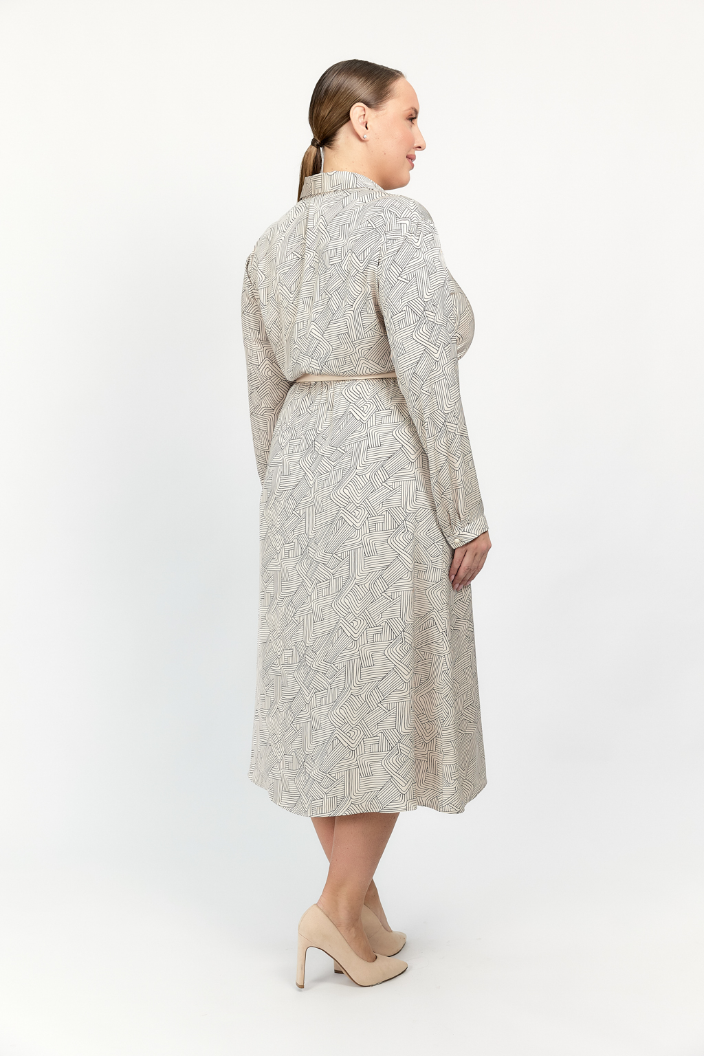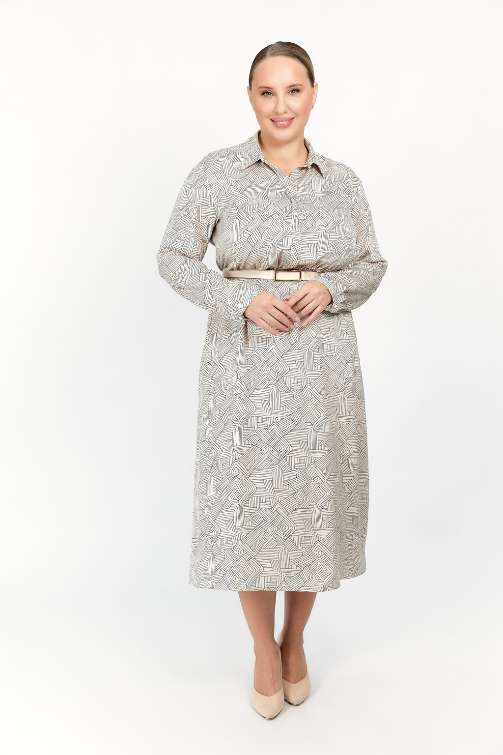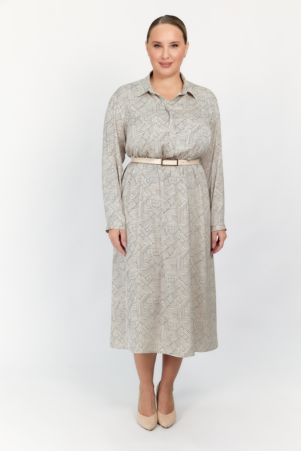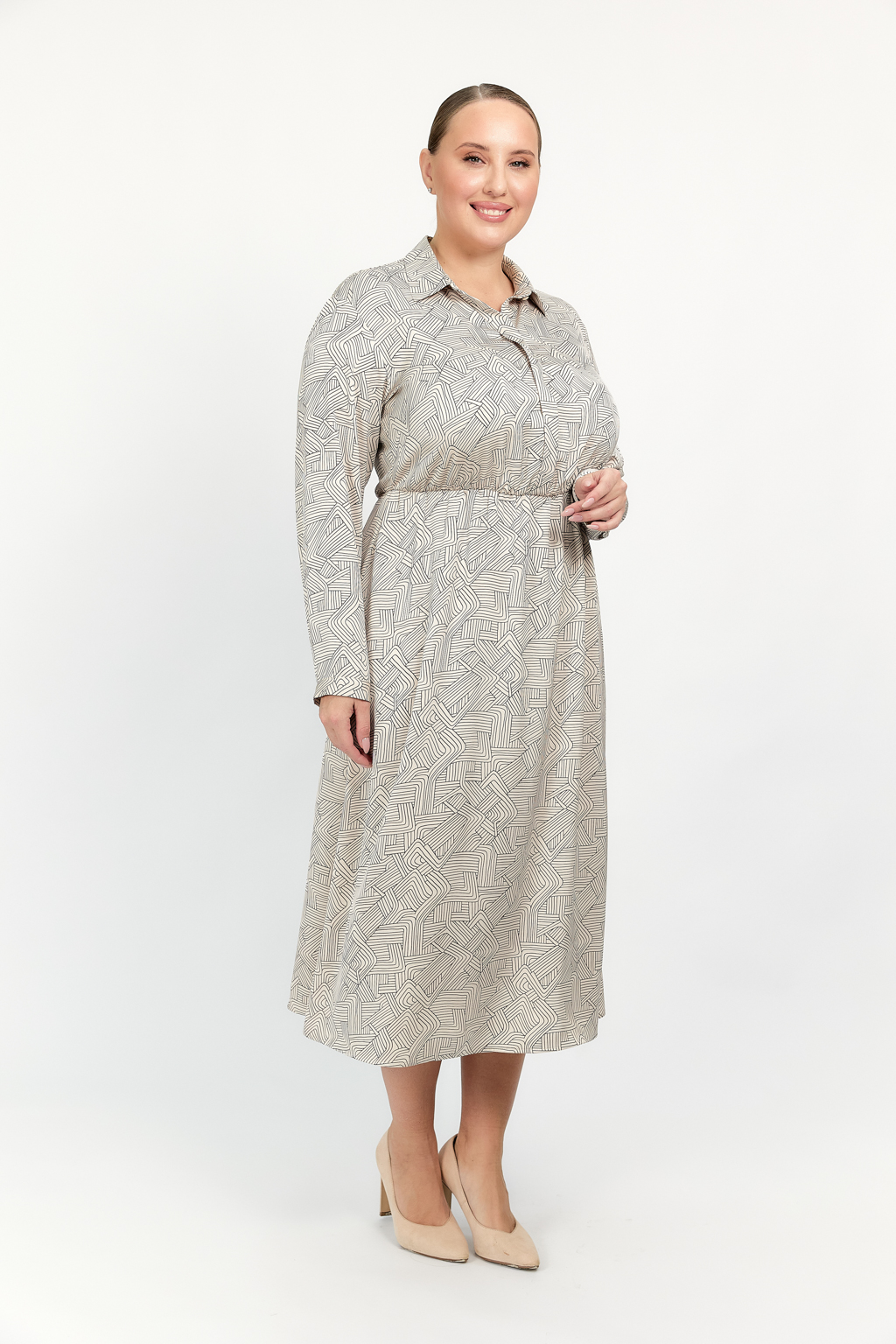Платье с отрезной юбкой длиной миди. Воротник рубашечный. Рукава стандартной длины.