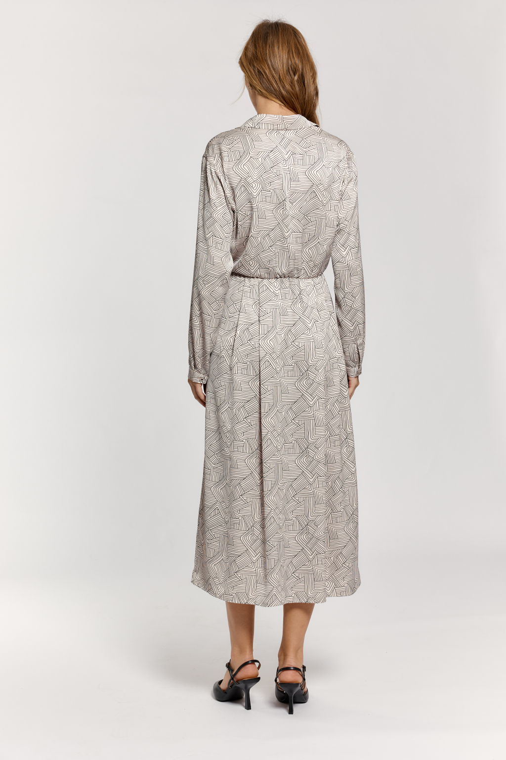 Креп блузочный с легким трендовым жемчужным блеском в бежевом цвете Линеарный абстрактный принт