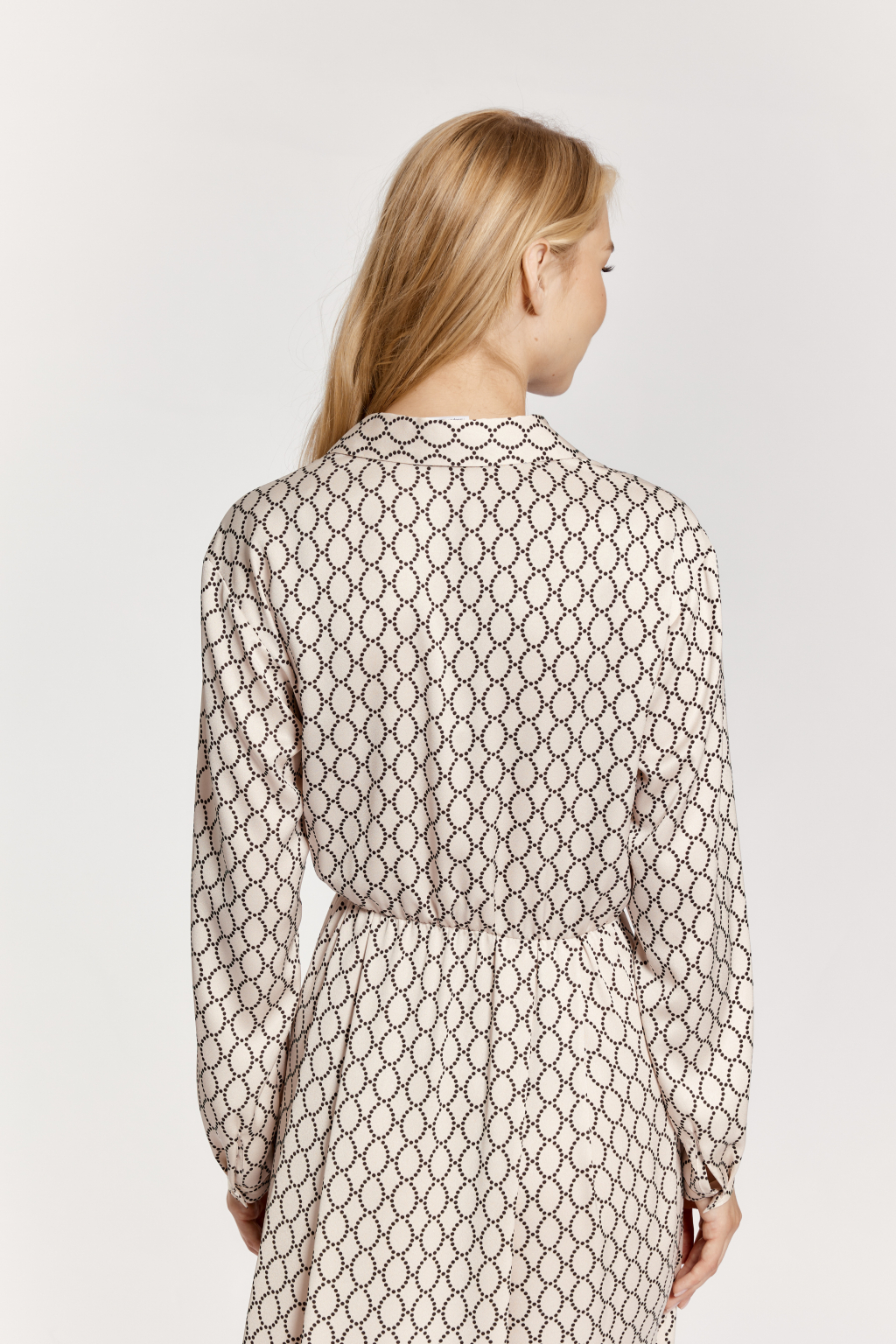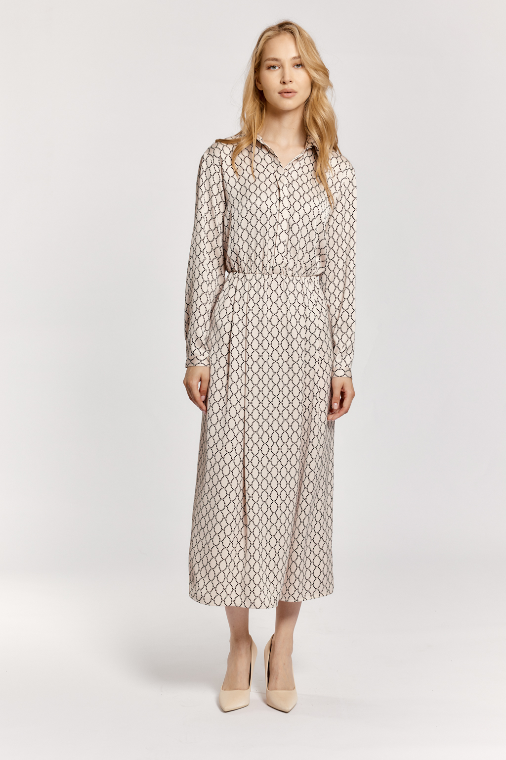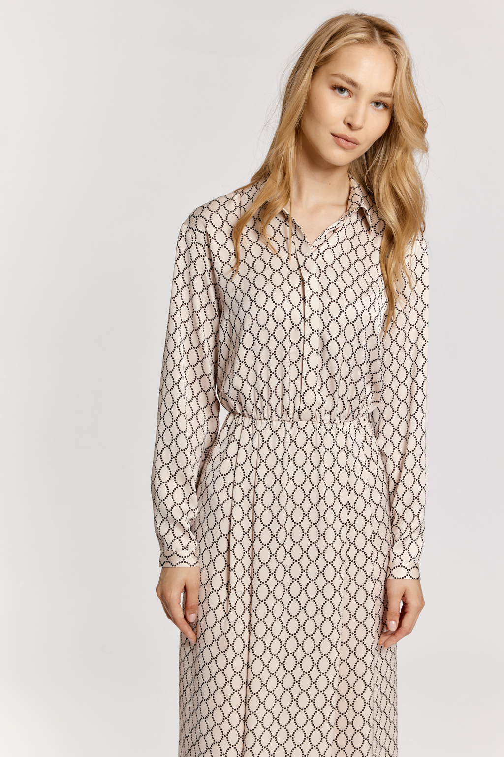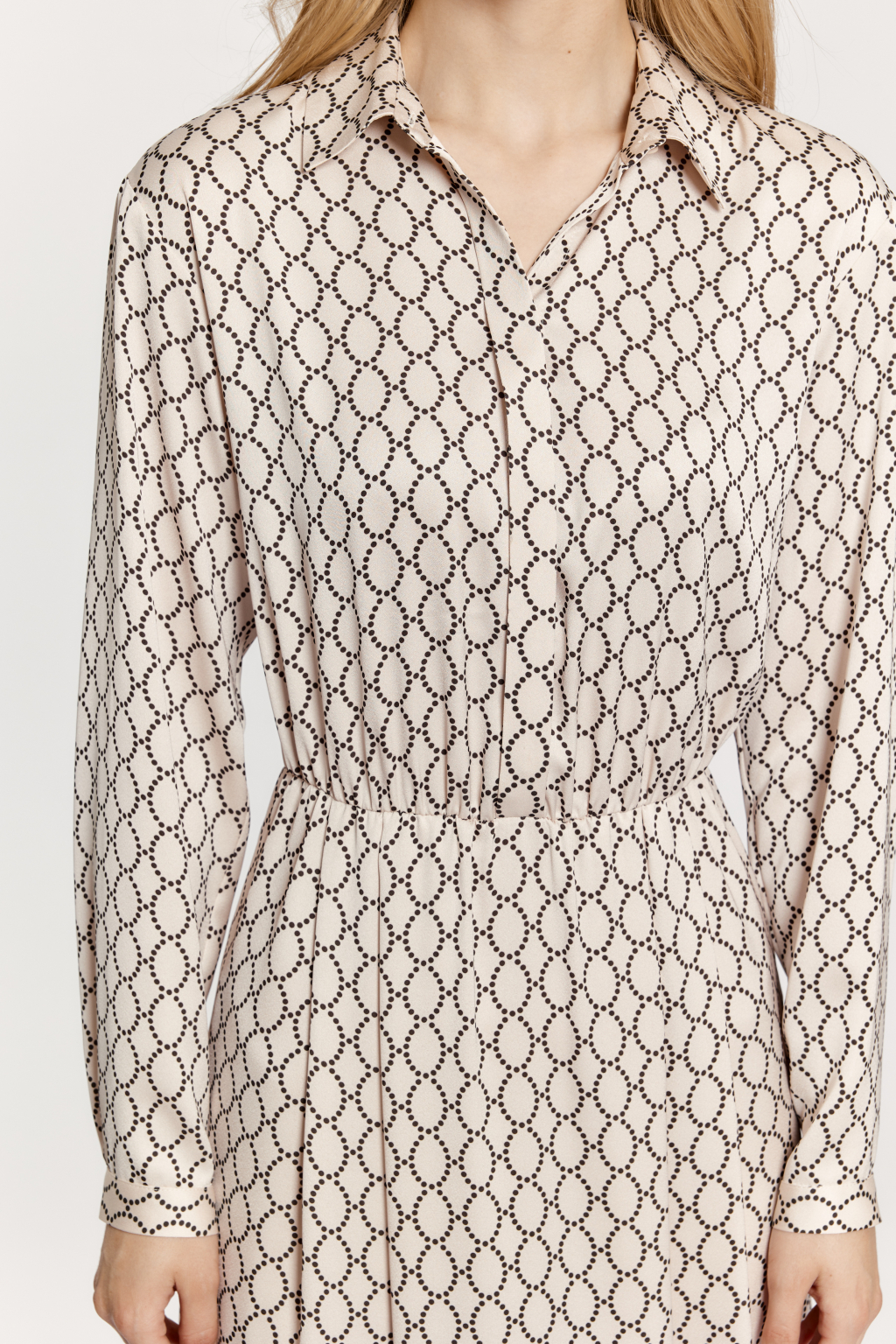 Креп блузочный с легким трендовым жемчужным блеском в бежевом цвете Принт в горох