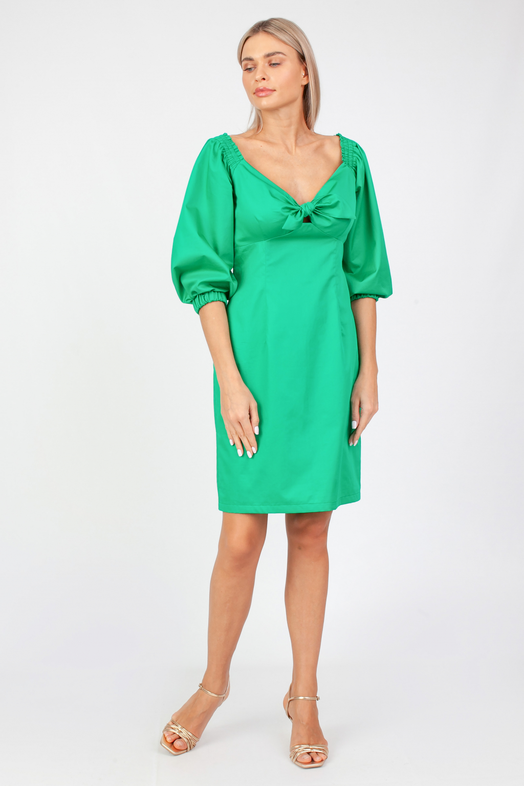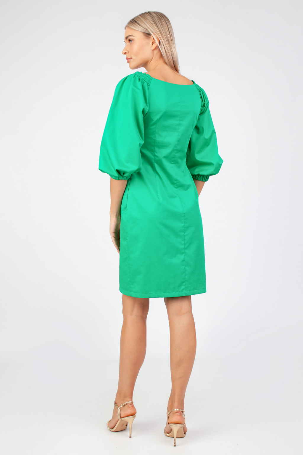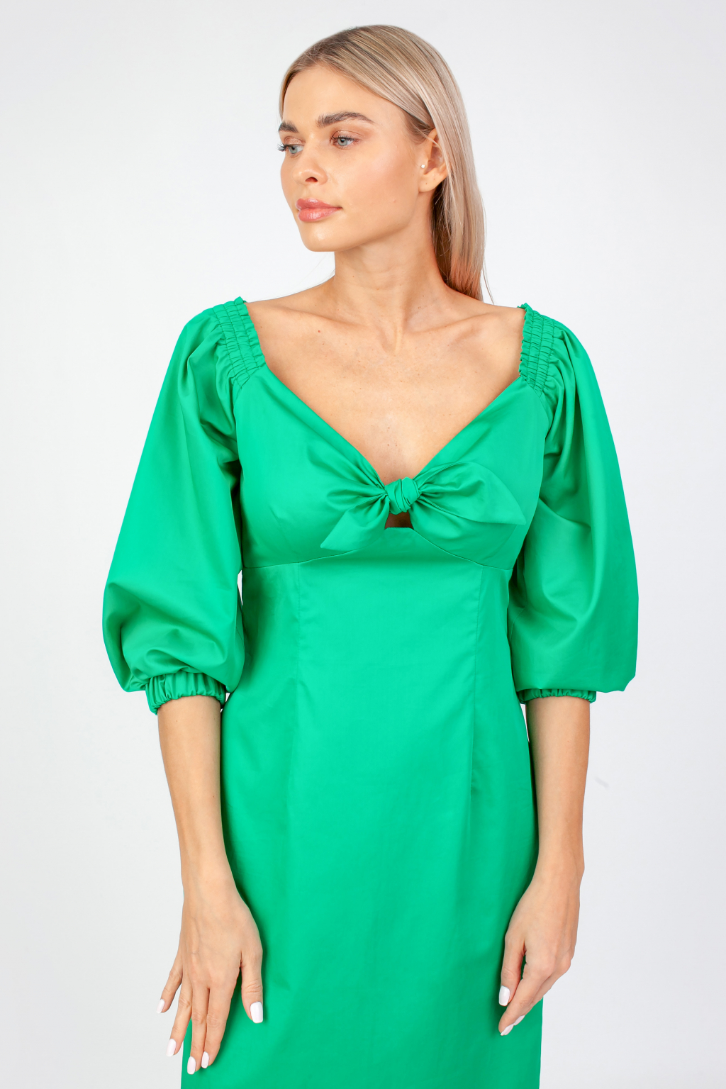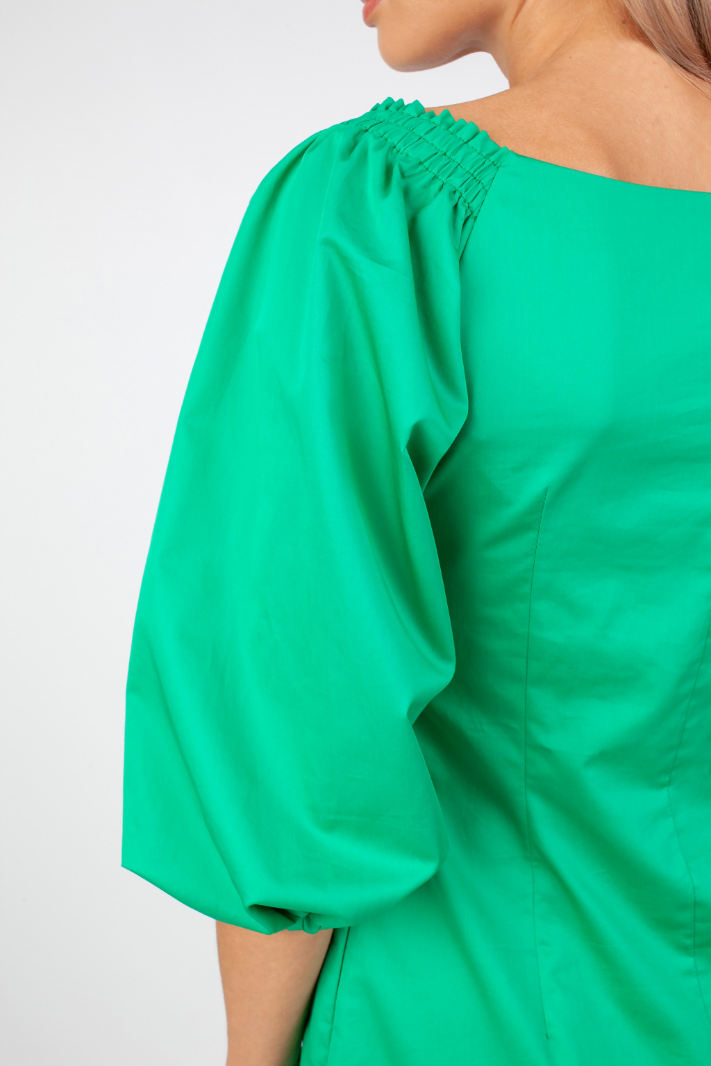 Силуэтное платье с фантазийным лифом и пышными рукавами в изумрудном цвете