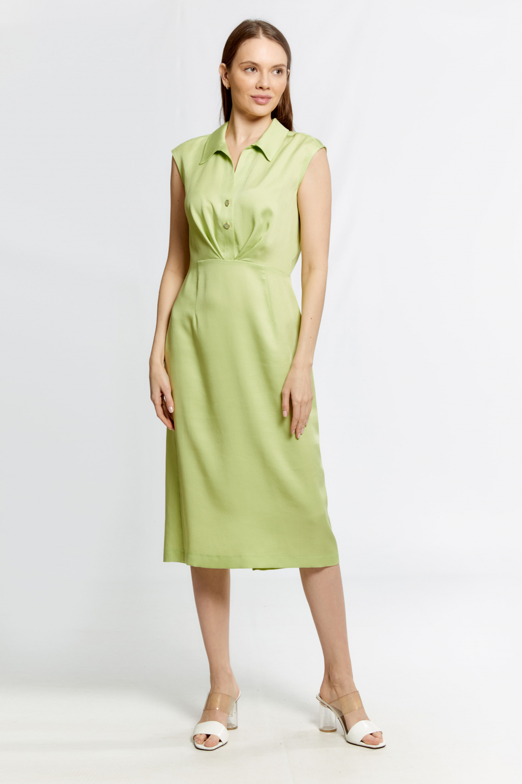 Силуэтное платье отрезное по линии талии с разрезом по задней половинке. Линия плеча спущена, в области планки по линии талии складки.