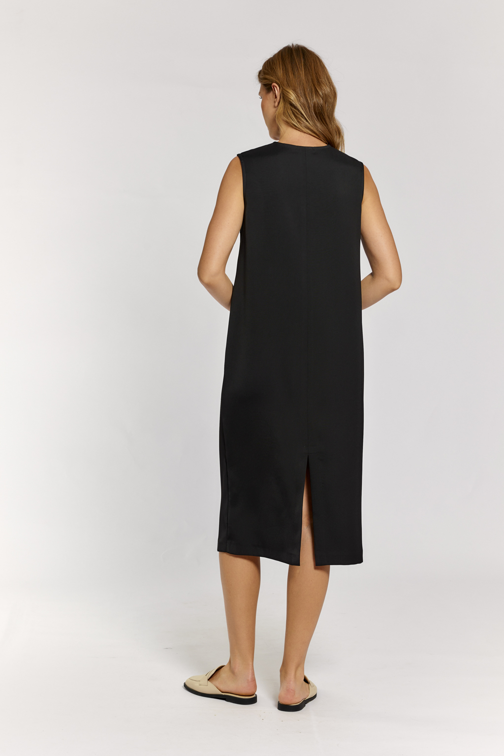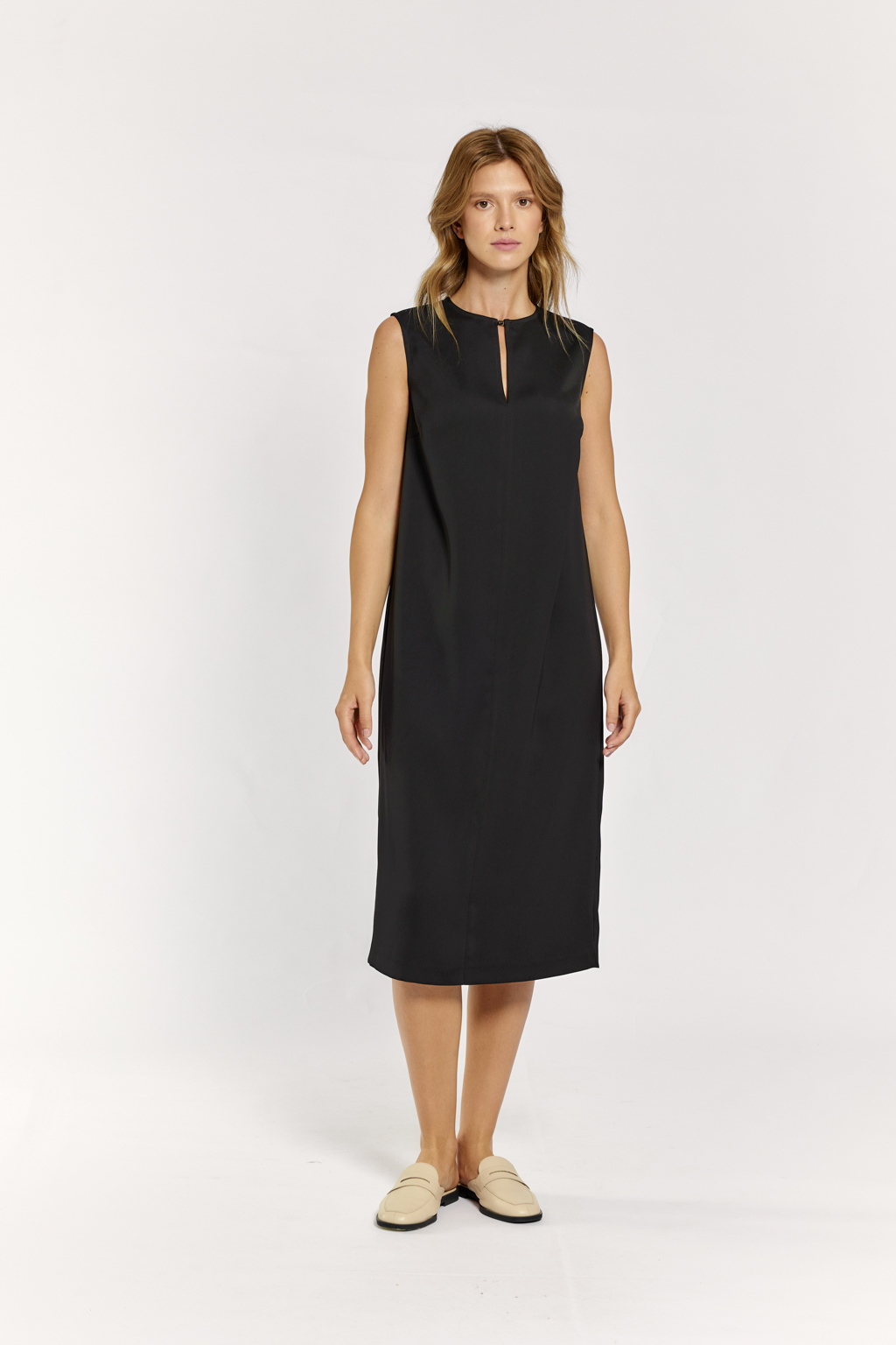 Платье прямого силуэта длиной миди с разрезом по полочке.