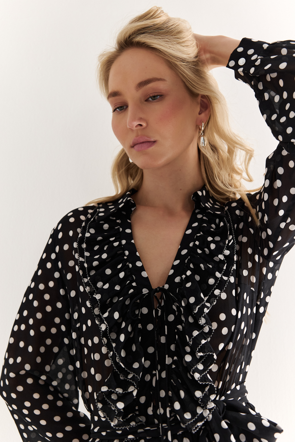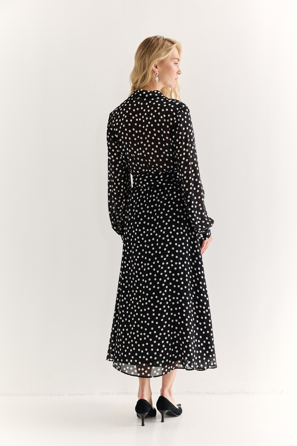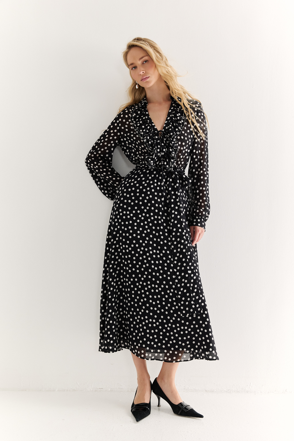 Платье миди в горох: винтажный шарм и деликатная женственностьЛёгкое платье из 100% вискозы с гороховым принтом — это дань утончённой романтике. Акцентная горловина с рюшами и завязками придаёт образу нотку винтажного шика. Прямой силуэт с мягким поясом подчёркивает талию, а длинная струящаяся юбка создаёт элегантную линию движения. Ткань из вискозы приятна к телу, дышит и красиво драпируется, делая это платье идеальным для повседневных прогулок, свиданий или лёгких выходов в свет.Нежность в каждом движении. Платье, которое говорит за вас.