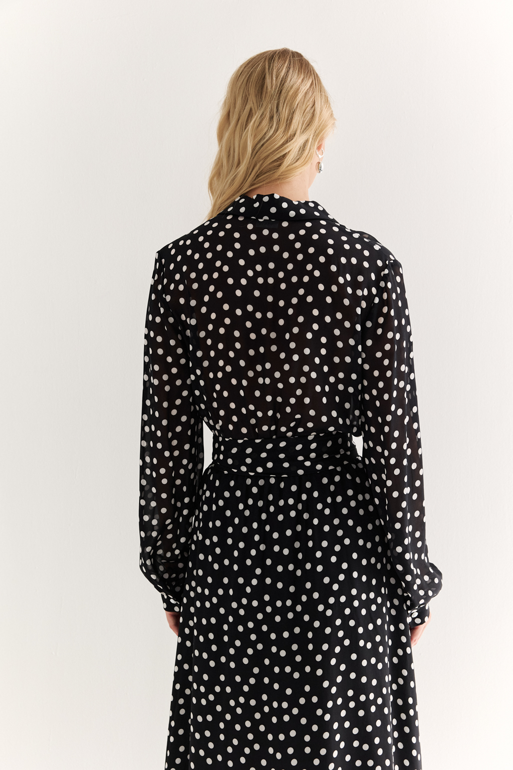 NEW, PREMIUM QUALITY Вискозный шифон крепового переплетения в молочный горошек на черном фоне