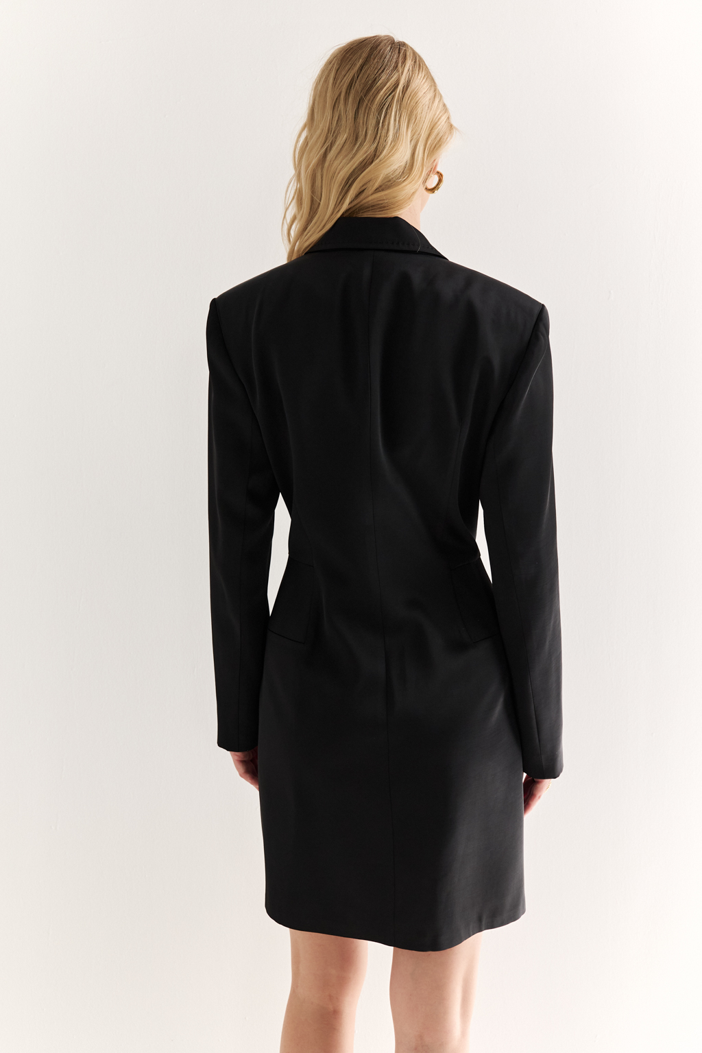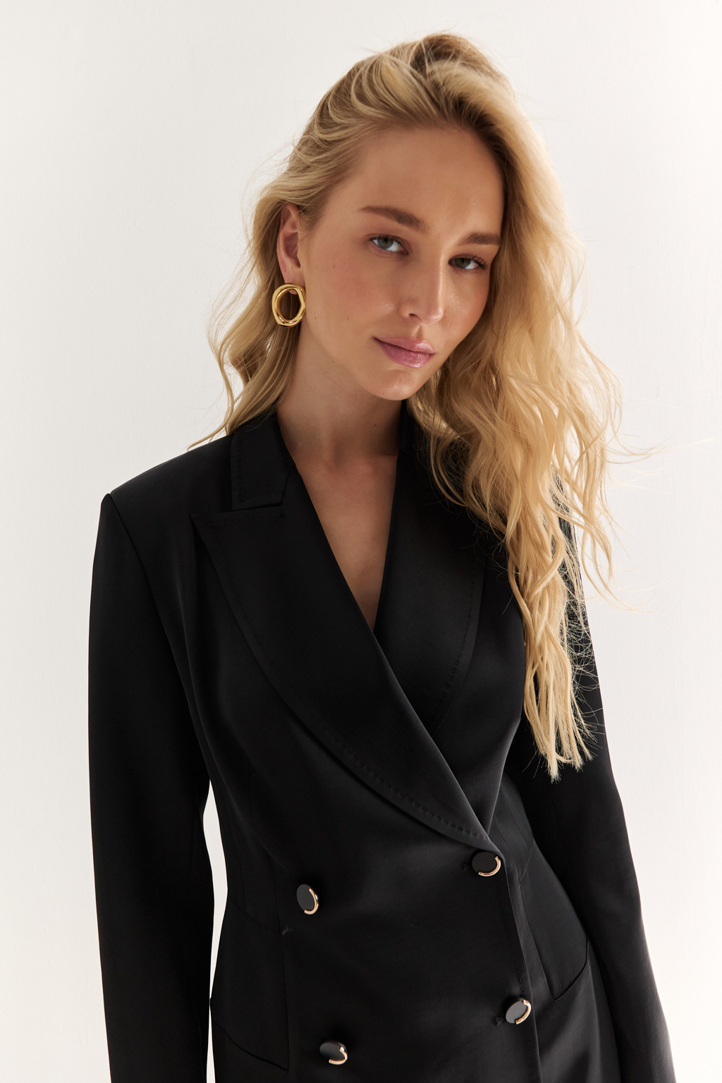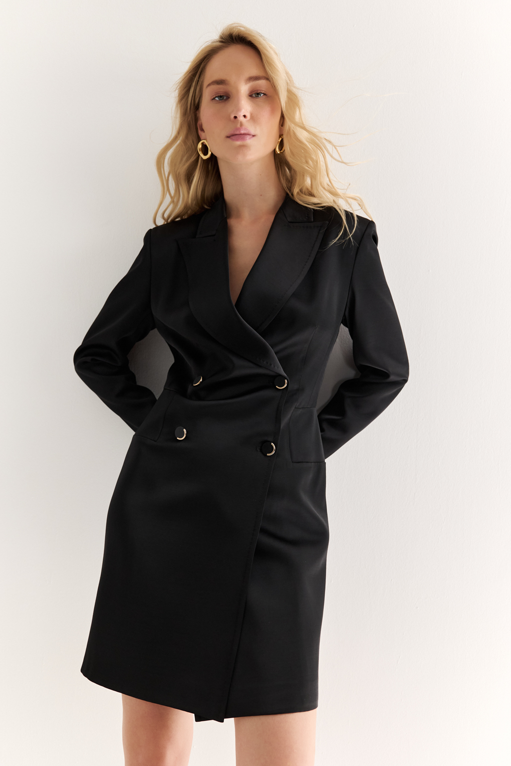 Жакет-платье: сила кроя и женственность формы Двубортный жакет-платье с чёткой геометрией — это ключевой элемент современного гардероба. Благодаря удлинённому силуэту он может быть как самостоятельным нарядом, так и стильным верхом в комплекте. Акцентные лацканы, структурированные плечи и двойной ряд пуговиц создают силуэт, который подчеркивает фигуру и транслирует уверенность. Приталенный крой формирует линию "песочных часов", а длина выше колена добавляет актуальности. Смелый, но универсальный — легко адаптируется под деловой, вечерний или повседневный образ. Гардеробный statement: баланс формы, структуры и женственности.