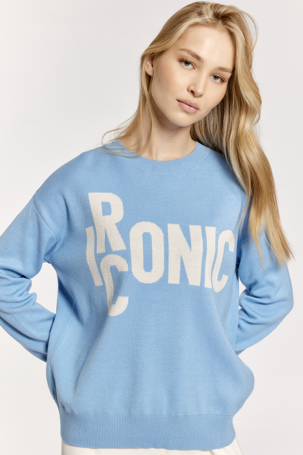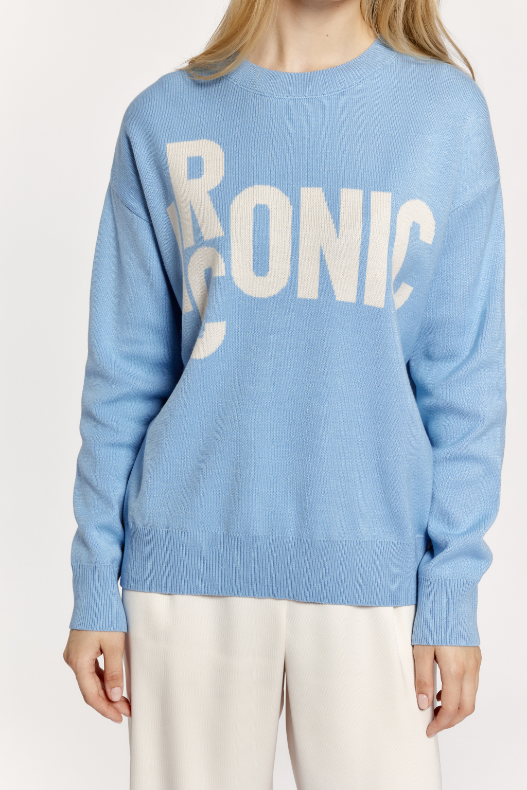 Джемпер со спущенной линии плеча прямого силуэта. Рукав стандартный длины. По полочке расположена надпись.