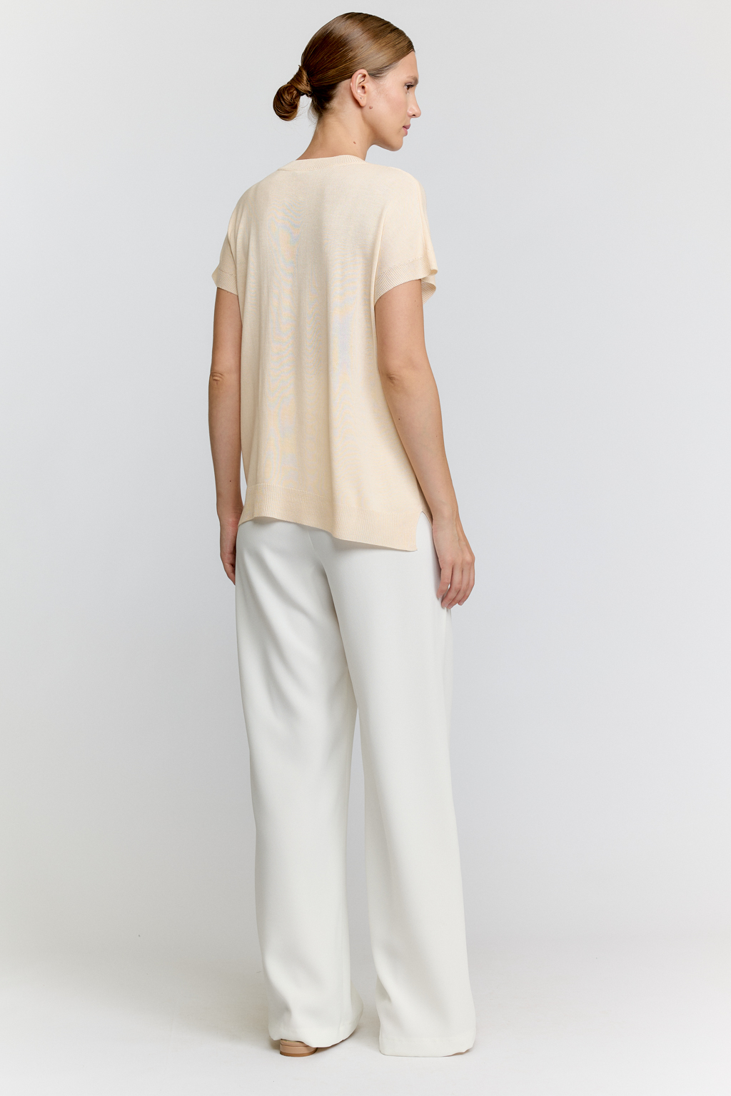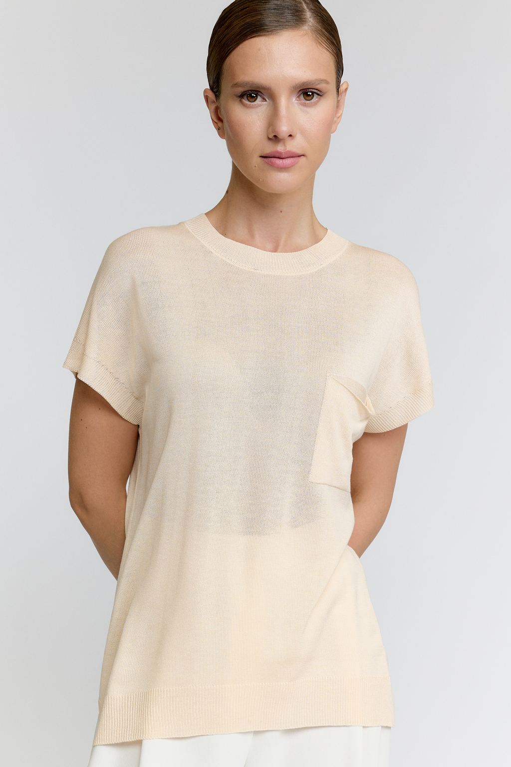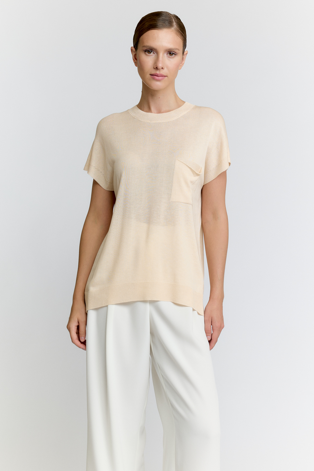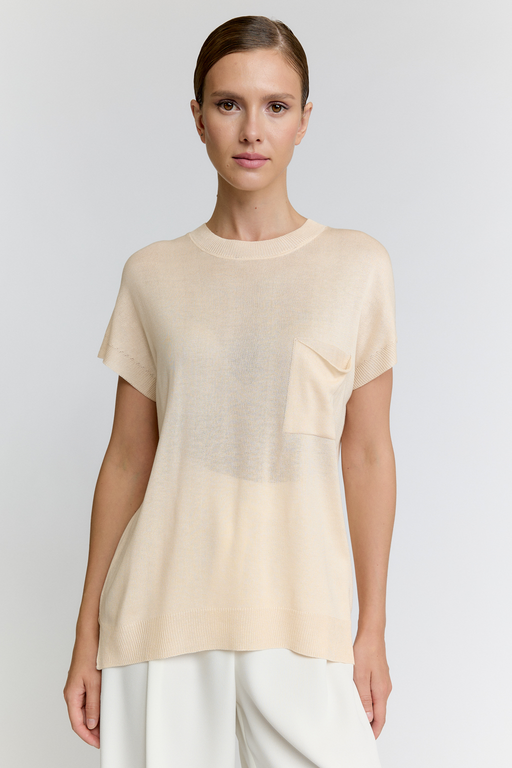 Джемпер со спущенными плечами и накладным карманам по груди.