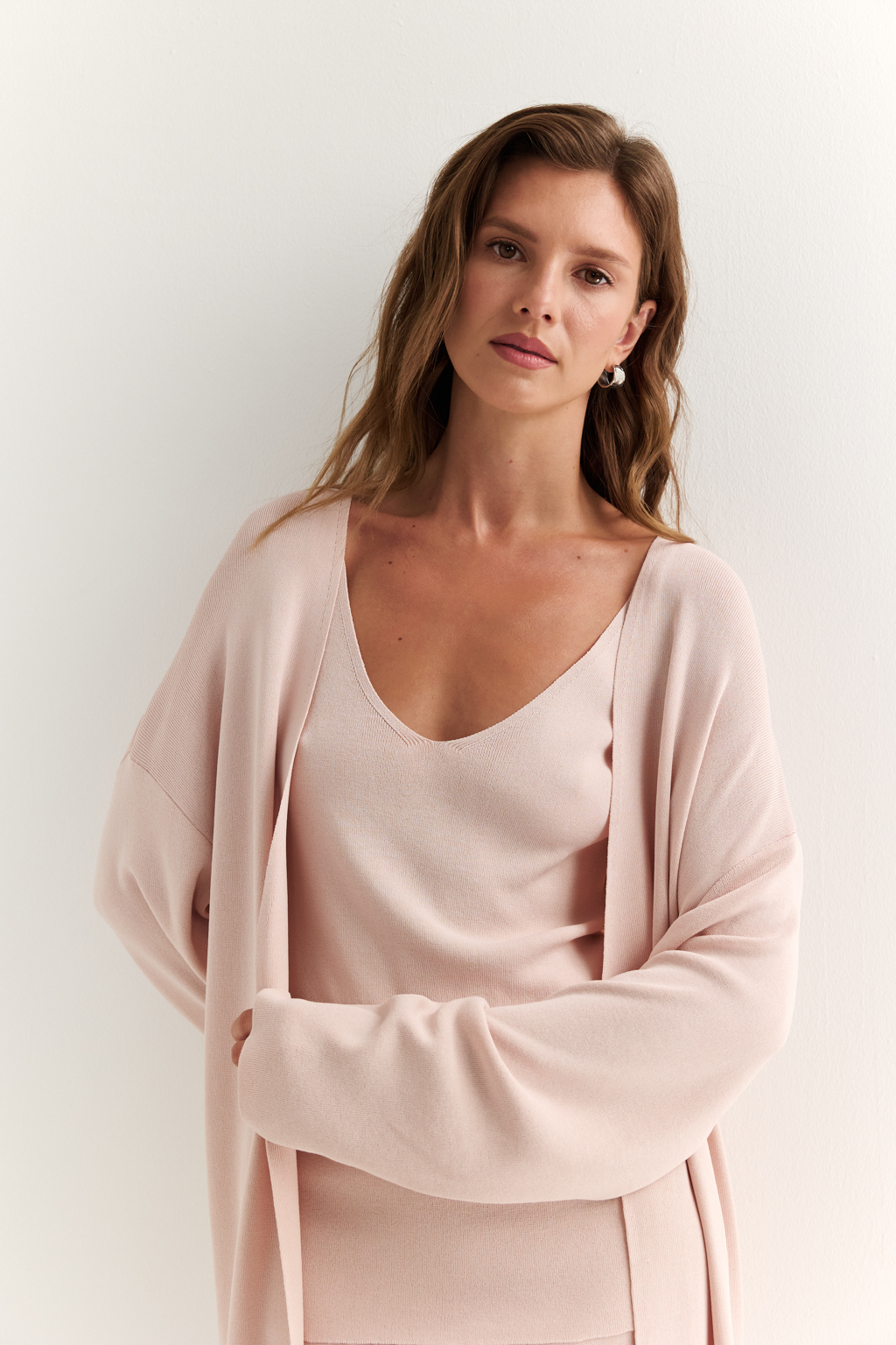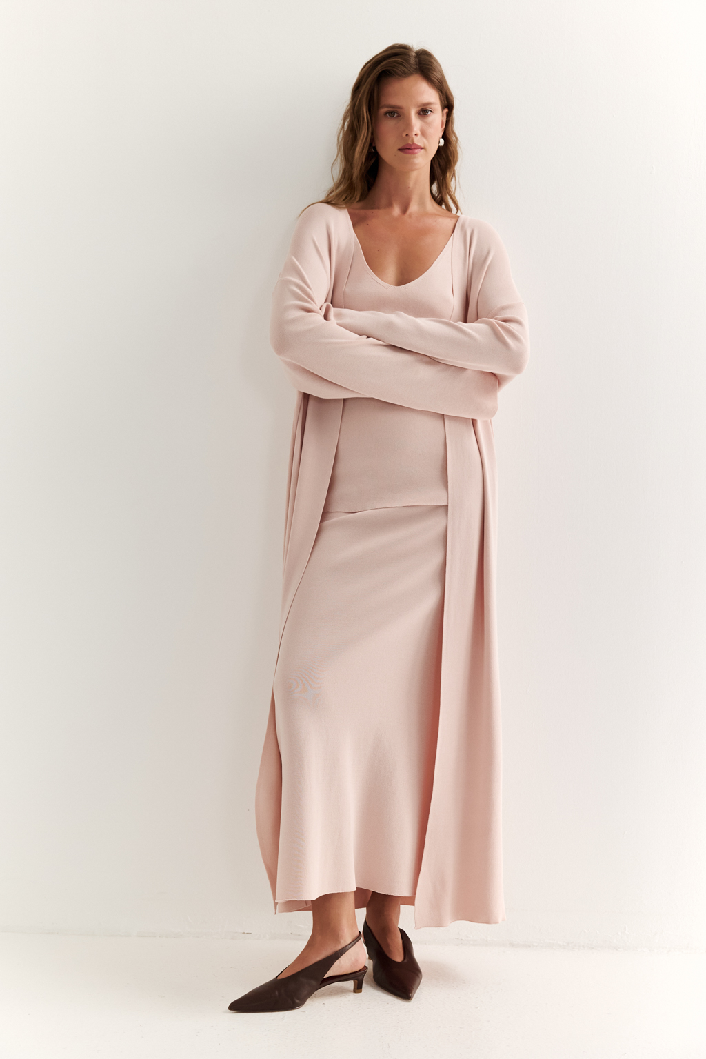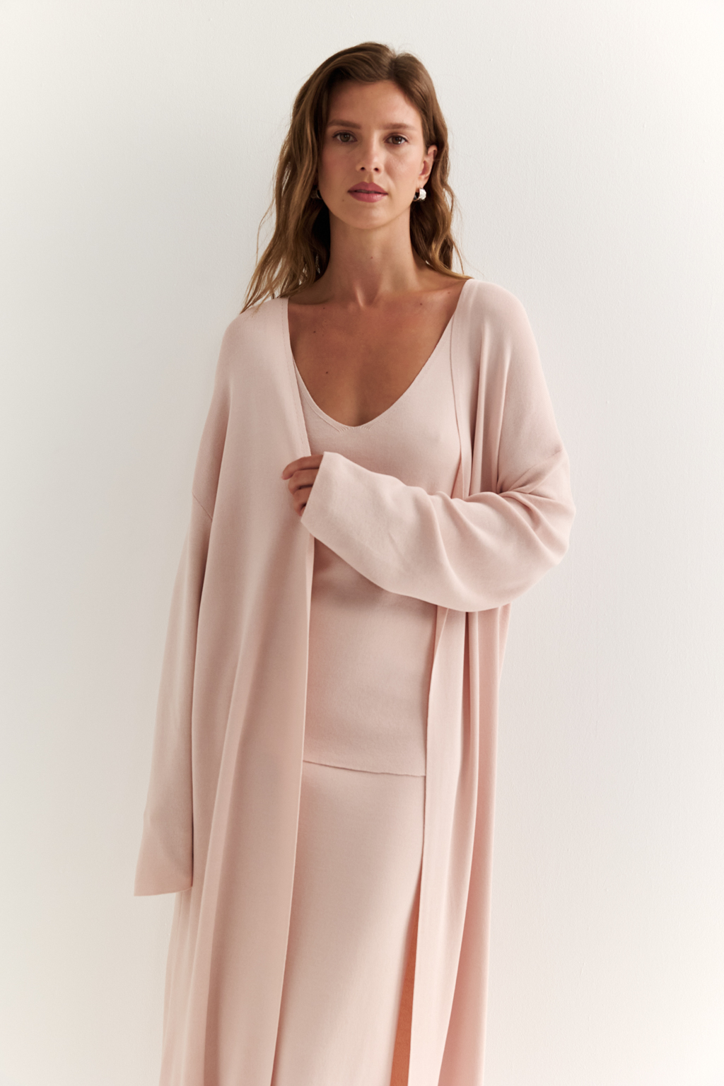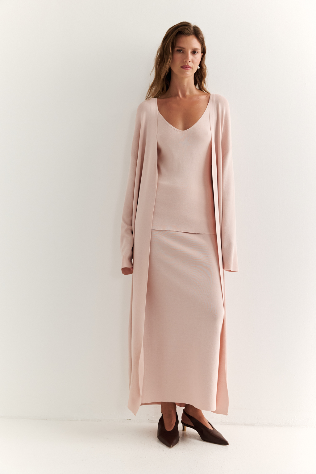 Кардиган длиной миди прямого силуэта с V-образным вырезом.