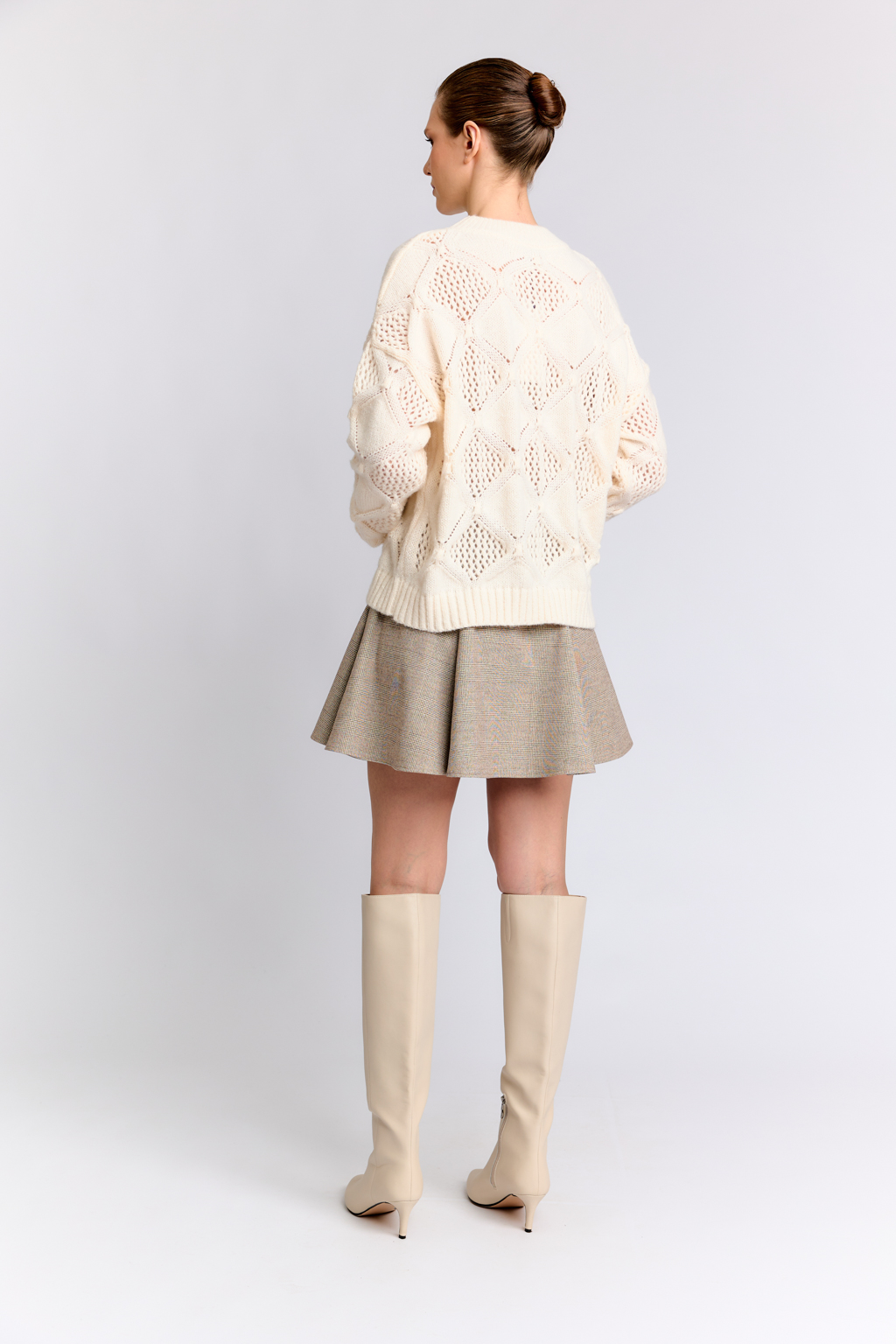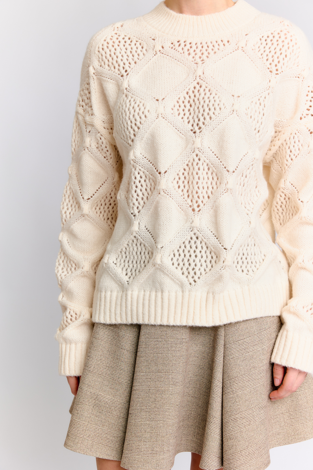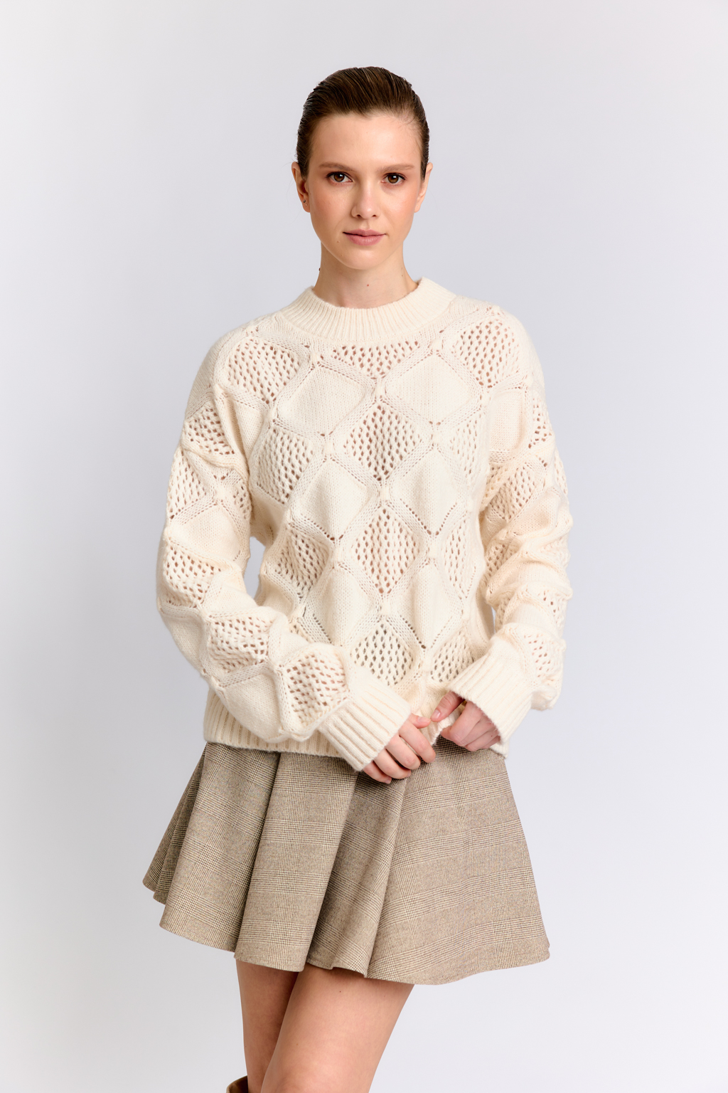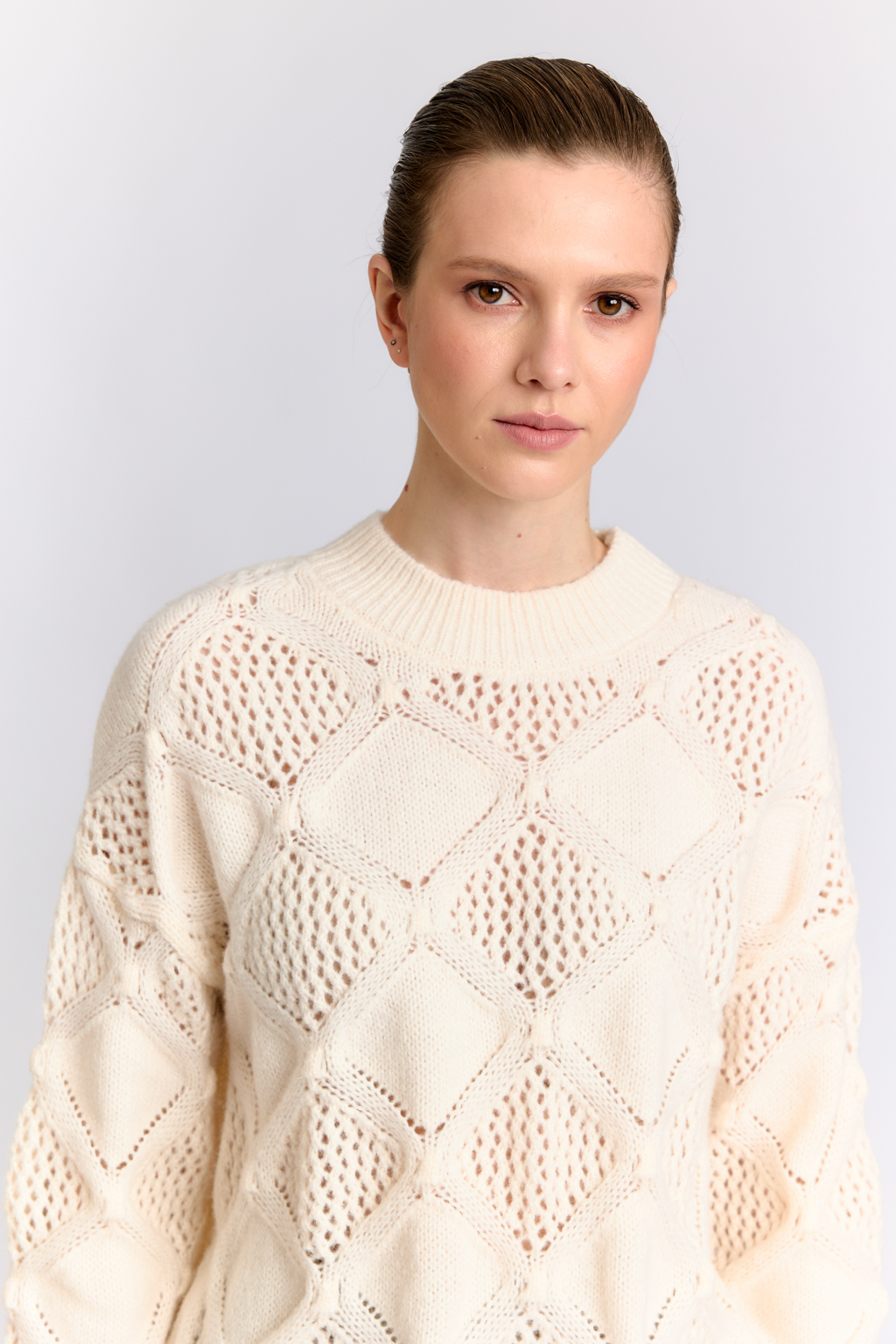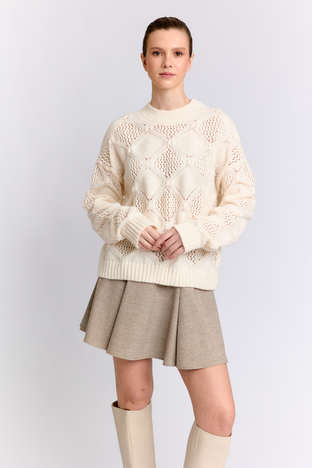 Джемпер со спущенными плечами и вязкой имитирующей ромбы.