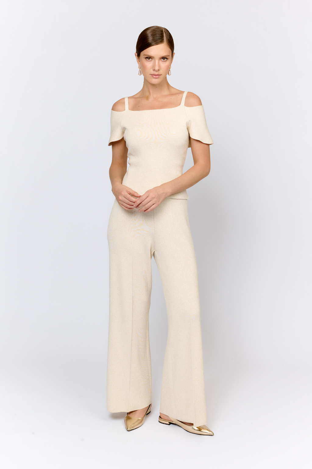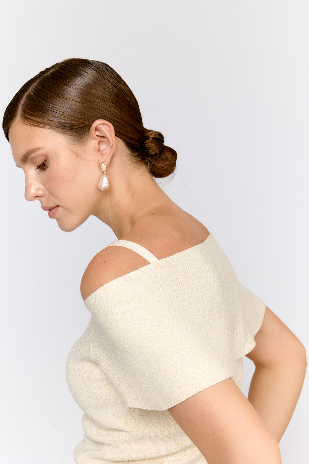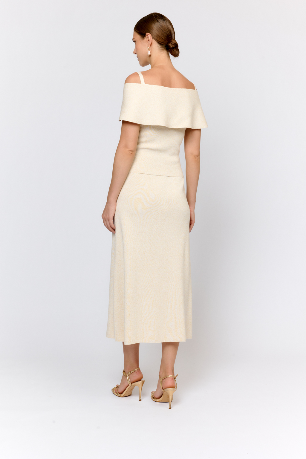 Топ на бретелях с открытыми плечами и пелериной. Оригинальный дизайн модели, подчеркивающий линию декольте и плечи воплощен в приятном к телу материале с вискозой в элегантном молочно-золотом цвете. Топ можно комбинировать с юбкой или брюками из аналогичного материала. Или сочетать в образах с текстильными брюками из коллекции.