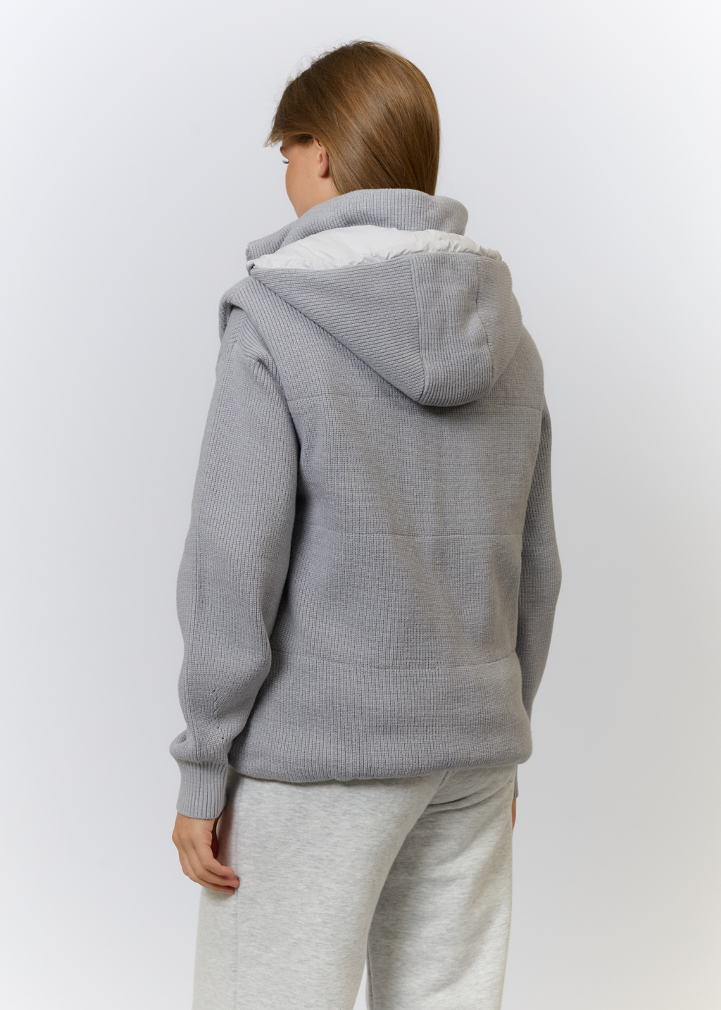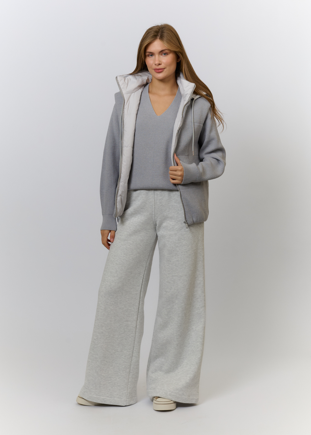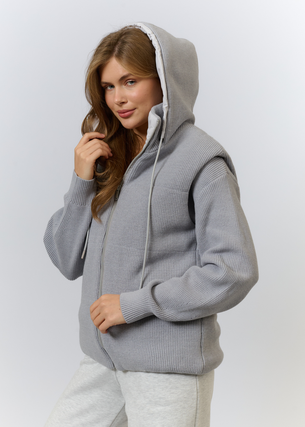 Вязаный трикотаж в светло-сером цвете (52% вискоза, 35% полиамид, 13% эластан) Утеплитель: холлофайбер