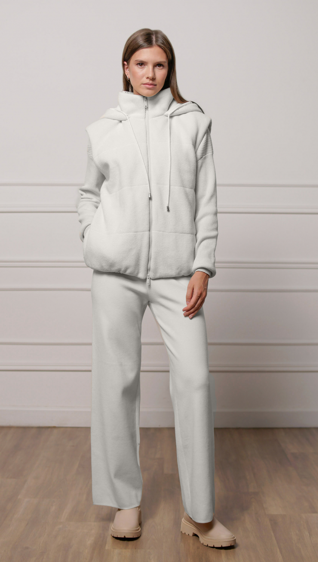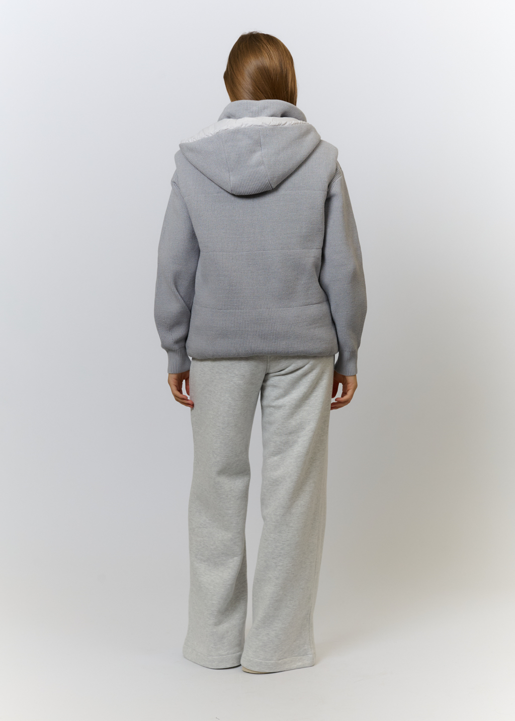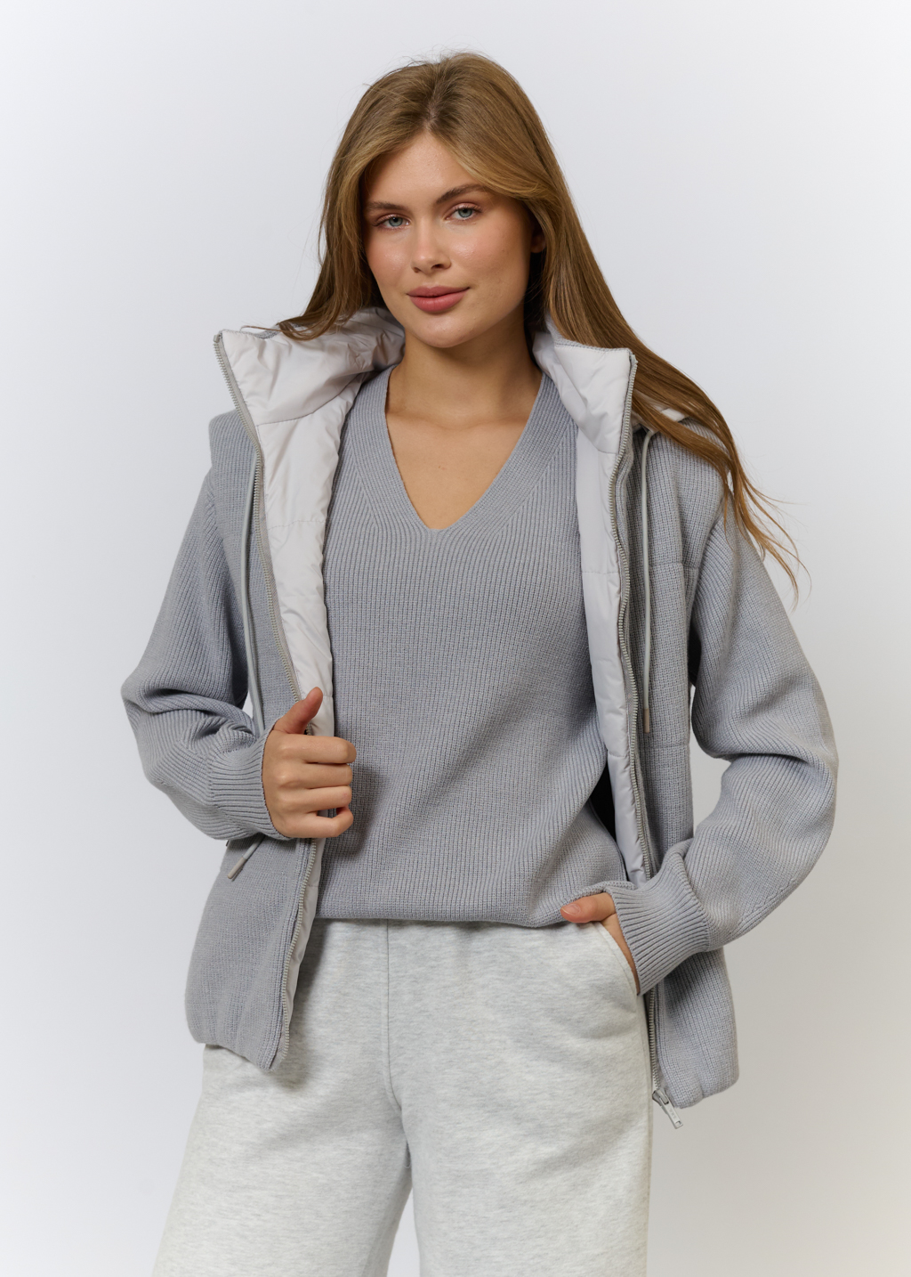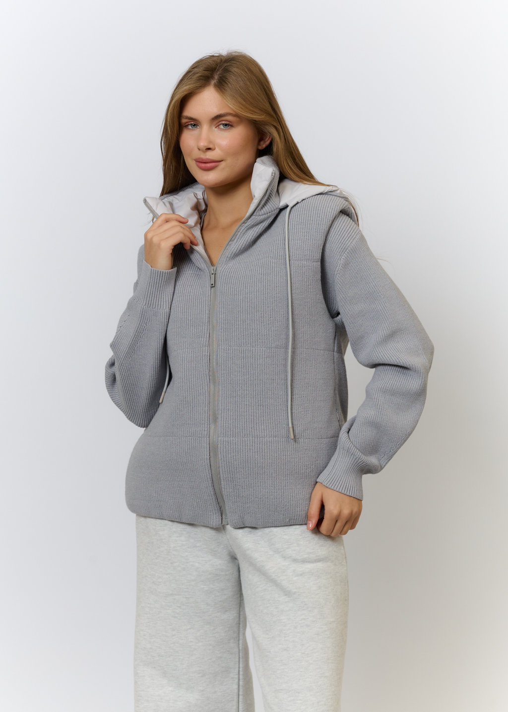 Вязаный трикотаж в светло-сером цвете (52% вискоза, 35% полиамид, 13% эластан) Утеплитель: холлофайбер