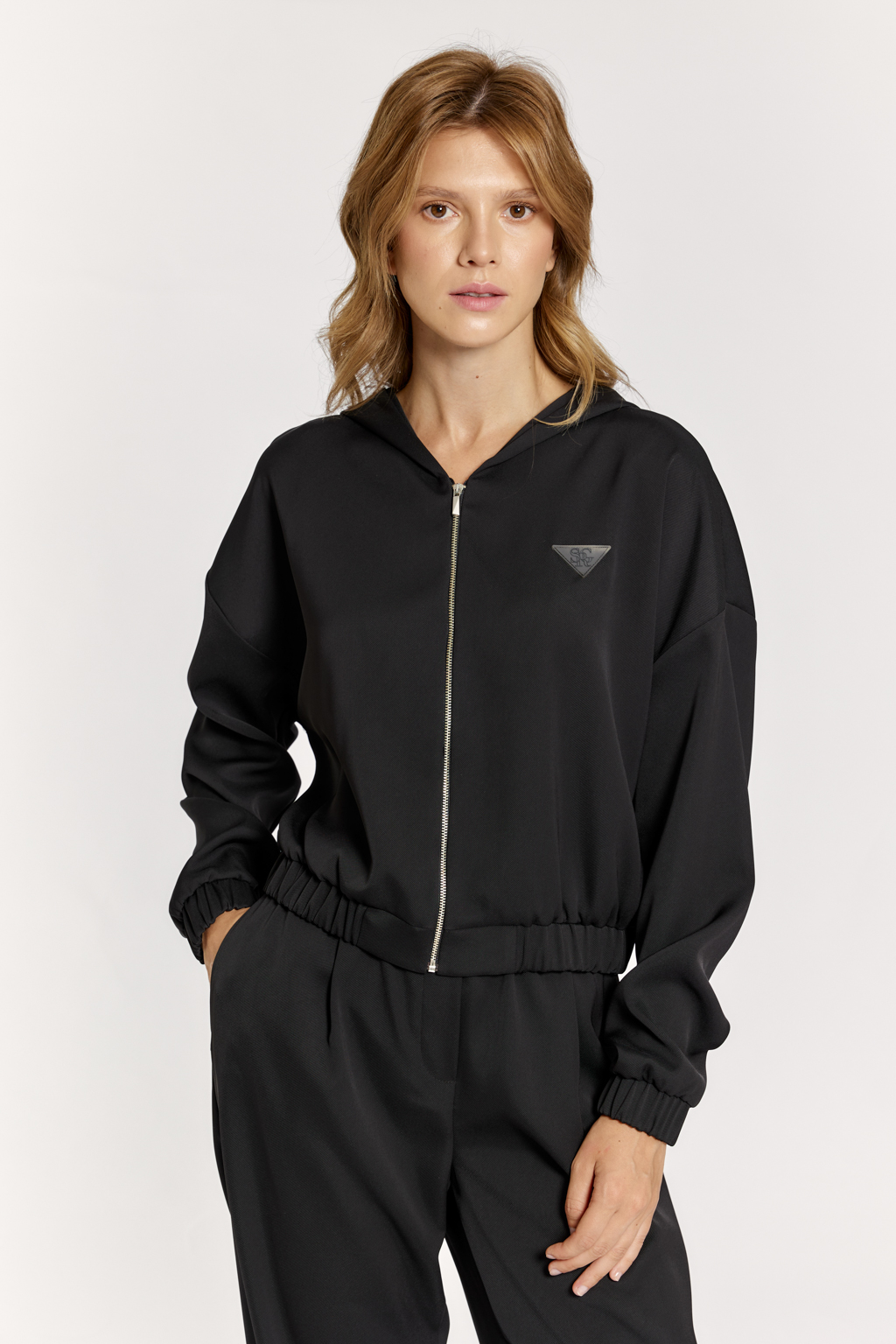 Бомбер укороченный с капюшоном и резинкой по низу. Застежка на молнию.